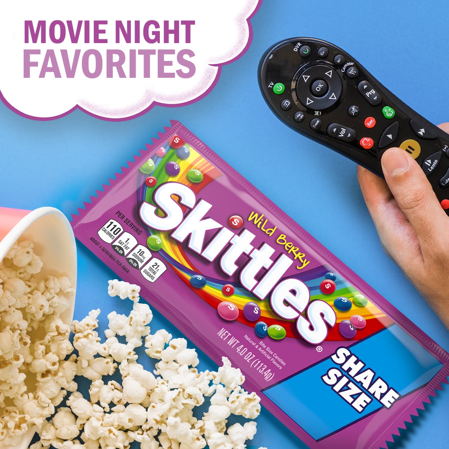 - Taste the Rainbow—Wild Berry Skittles includes berry punch, strawberry, melon berry, wild cherry, and raspberry flavors.