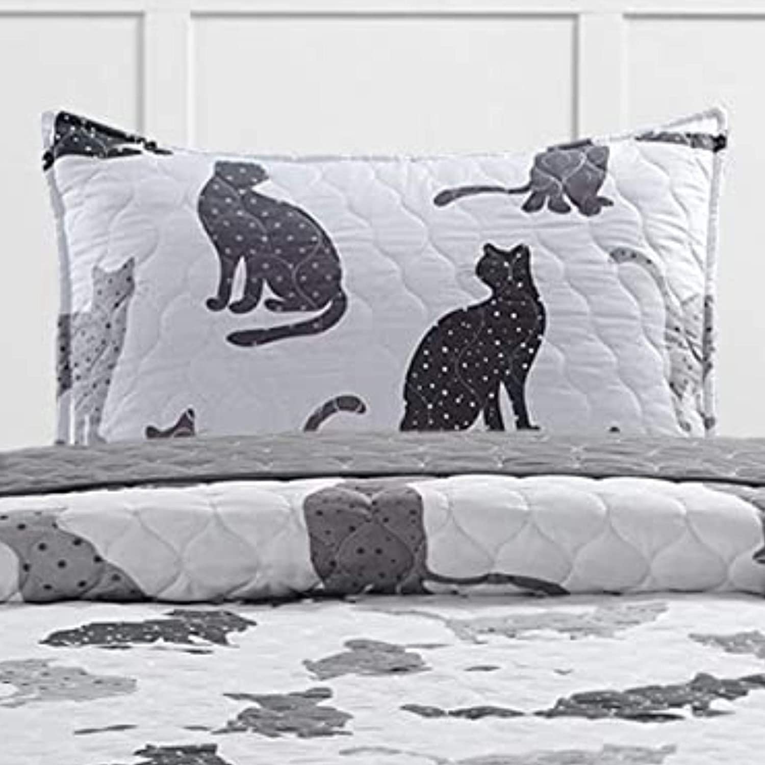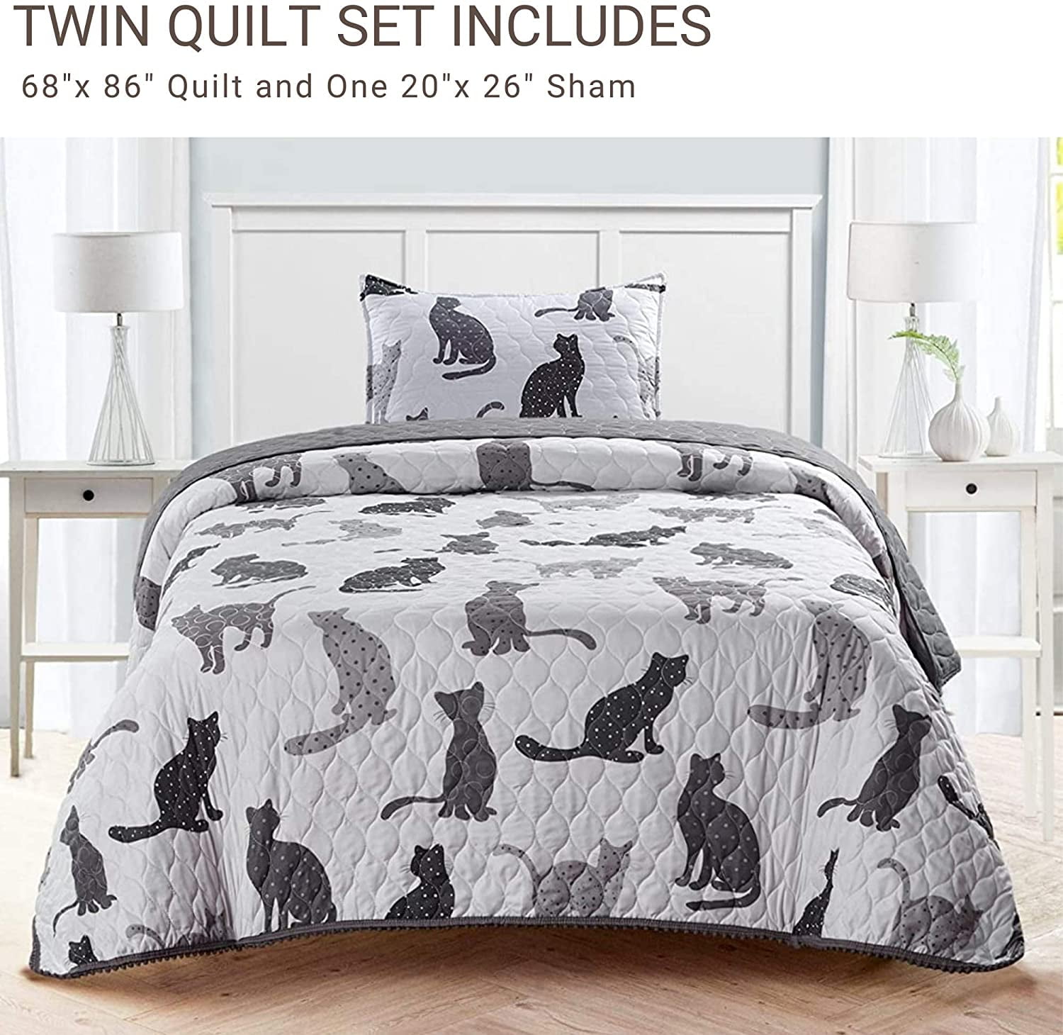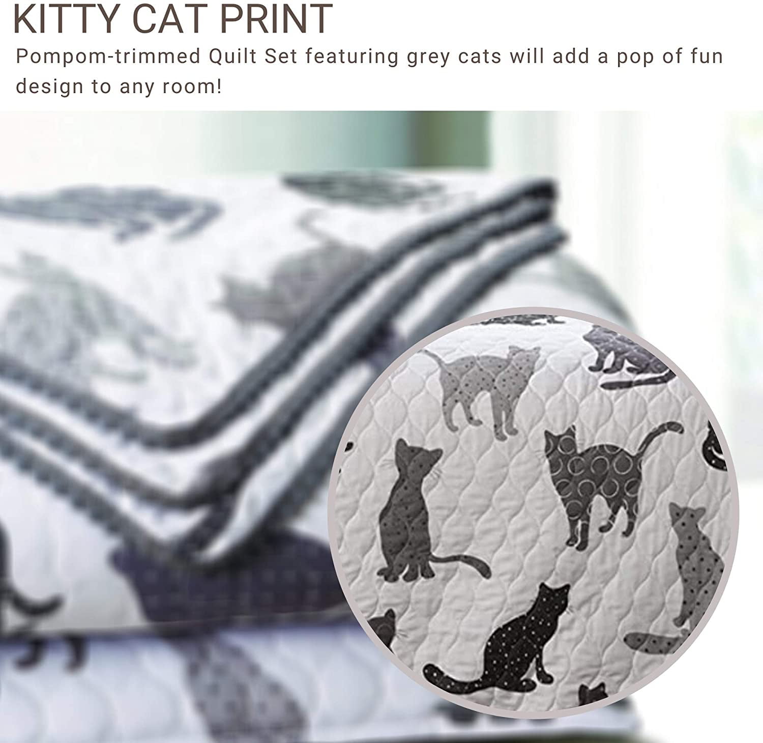 Sleeping Partners 2 Piece Set, Grey Kitty Cat Quilt Set with Pom Poms, Grey, Cats, Twin