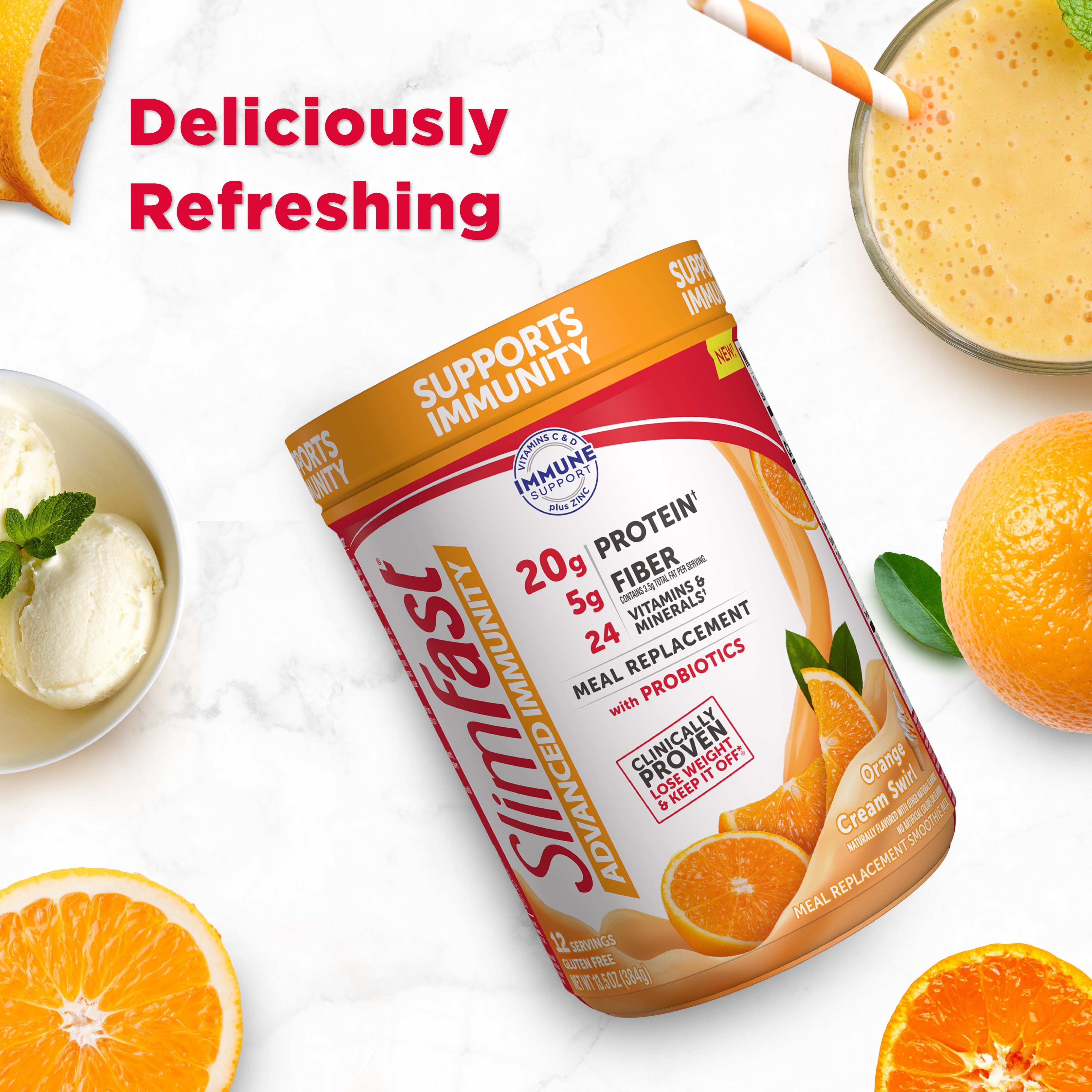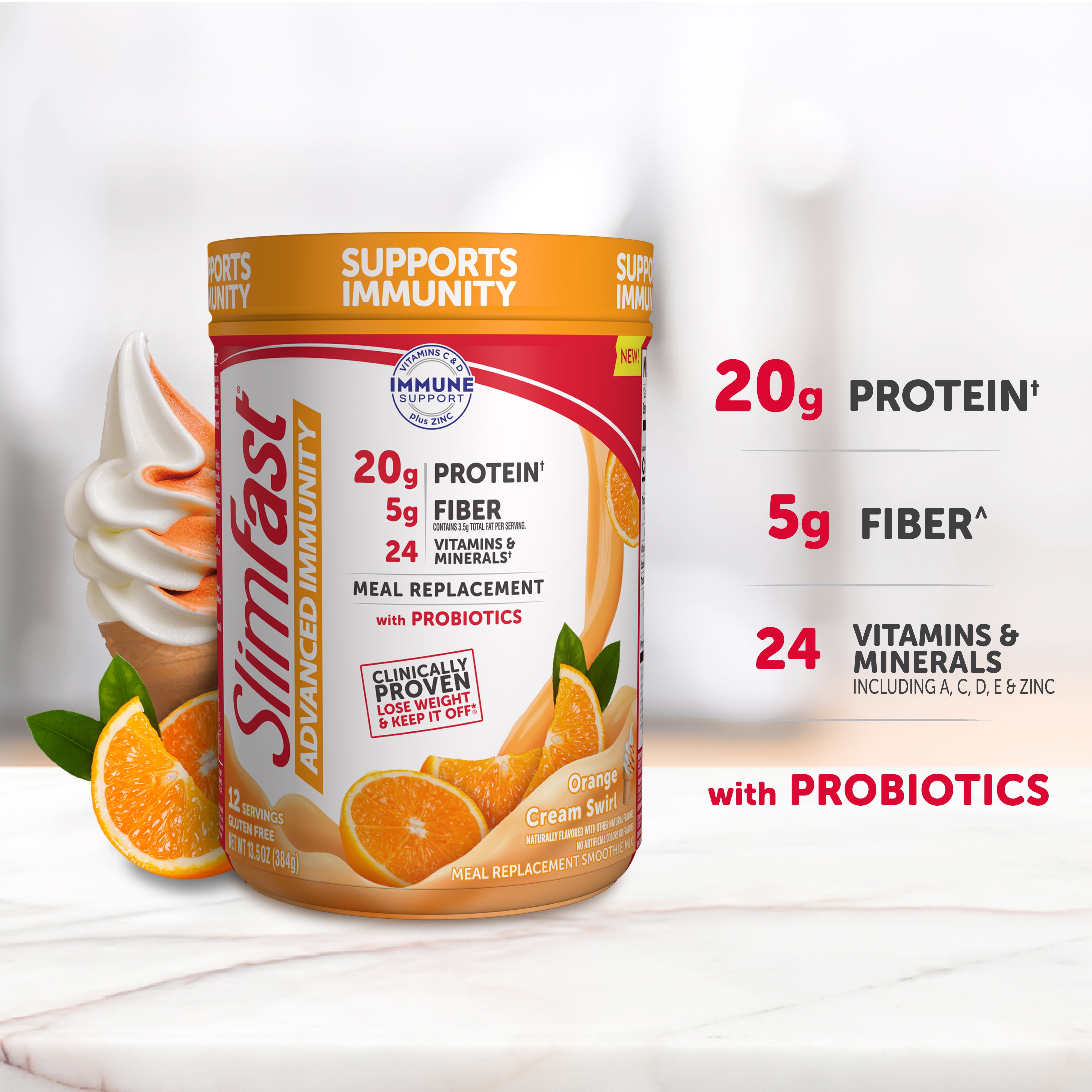 Give your immune system a boost with SlimFast Advanced Nutrition Orange Cream Swirl Smoothie Mix. This immunity supplement is packed with protein, fiber, 24 essential vitamins and minerals, and probiotics. Flavored like an orange cream swirl frozen yogurt, this smoothie mix is also a delicious way to reach your weight-loss goals. Simply combine a scoop of SlimFast powder with 8 fl oz. of fat-free milk in a shaker cup or blender and enjoy. The SlimFast Plan is as easy as 1-2-3. Enjoy 1 sensible meal, 2 SlimFast meal replacements, and 3 SlimFast snacks. The SlimFast Plan is clinically proven to help you lose weight and keep it off!
