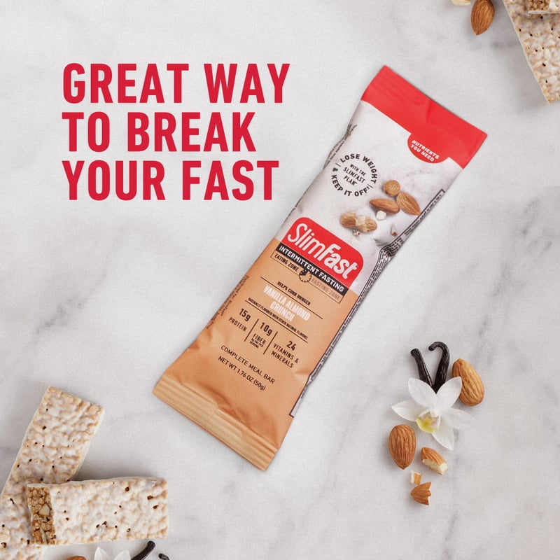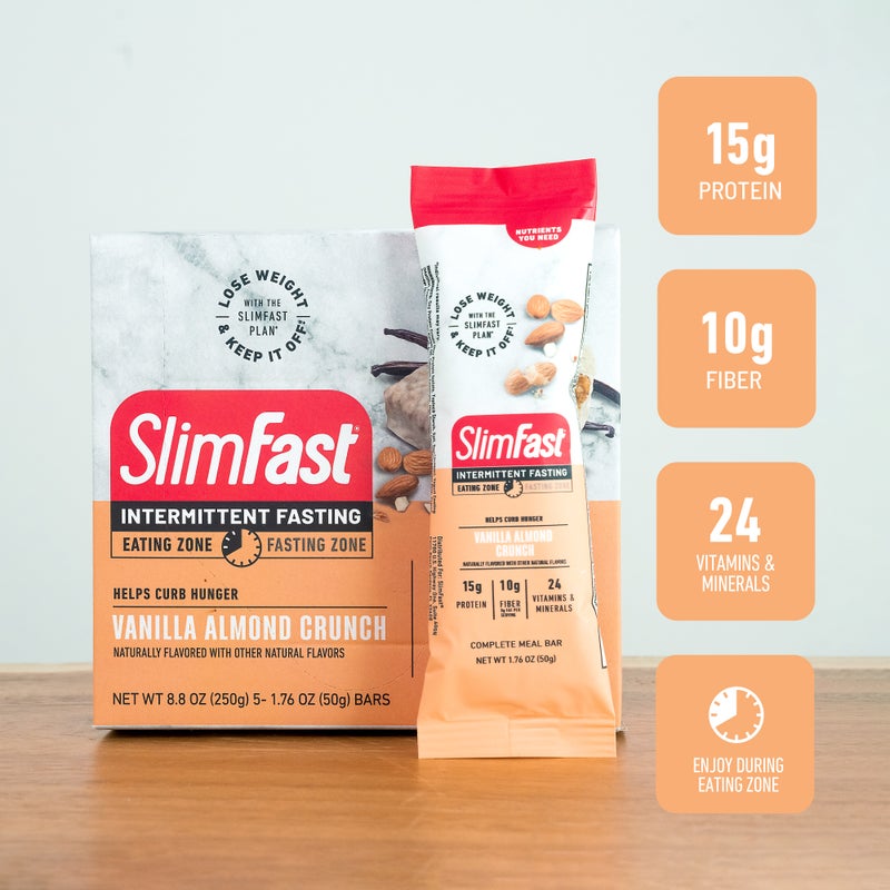 The SlimFast Intermittent Fasting Vanilla Nut Crunch Complete Meal Bar has the nutrients you need to break your fast or enjoy anytime during your eating zone. You won’t be able to get enough of the toasty almond indulgence deliciously blended with the enticing flavor of exotic vanilla, and coated in a decadent icing. With 15 grams of protein and 10 grams of fiber*, you can indulge your senses while you nourish your body! Crafted with your goals in mind, each delicious Complete Meal Bar provides 24 vitamins & minerals – including A, C, D, E & Zinc – delivering tasty and portable fuel for your Intermittent Fasting journey!1. An excellent option to break your fast with the nutrients you need or to enjoy any time in your eating zone;2. Each SlimFast Intermittent Fasting Complete Meal Bar is packed with almonds, crunch, and delicious exotic vanilla flavor;3. 5 individually wrapped bars per box to help you tackle your busiest days;4. Each Complete Meal Bar is packed with 15g of protein and 10g of fiber;5. Provides 24 vitamins and minerals, including A, C, D, E and Zinc;6. 8g Fat Per Bar