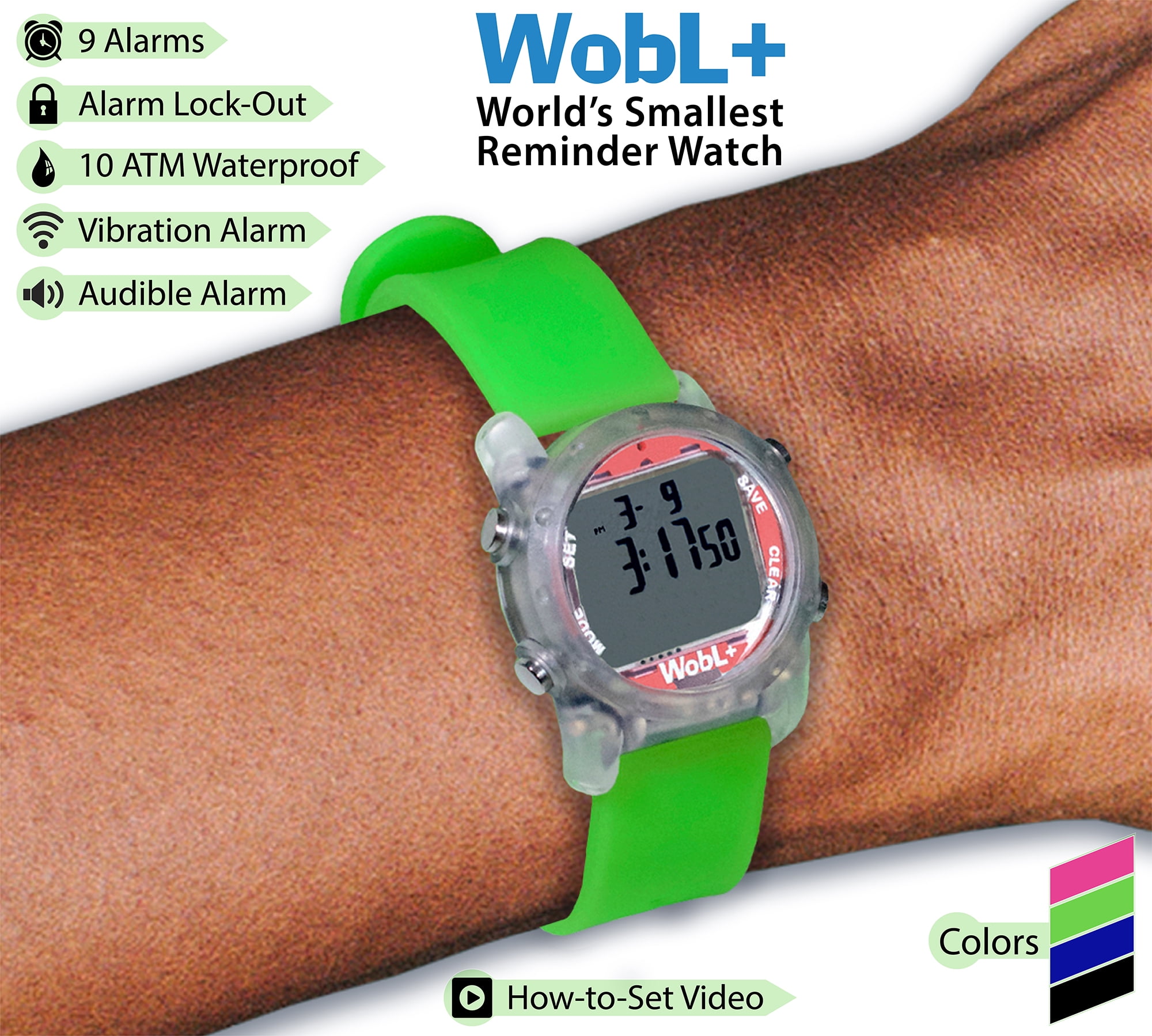 The Wobl + Watch is the smallest vibrating, water resistant, alarm reminder watch in the world! The Wobl+ watch is the perfect choice for timed reminders; medications, bathroom breaks, important tasks, and more! The watch is also great to assist those with hearing impairment, ADD and ADHD.