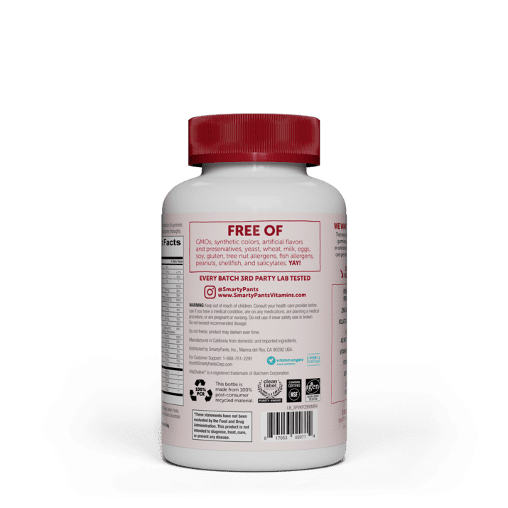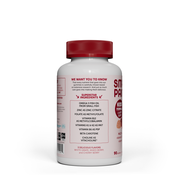 SmartyPants Kids Formula gummies are packed with over 15 premium nutrients including omega-3 EPA and DHA essential fatty acids (sourced from sustainably-sourced wild caught, small fish), vitamin D3 for immunity, vitamins K1 and K2 for bone health, vitamin B12 for energy, vitamin A for eyesight, and folate as methylfolate — all in one delicious gummy without any of the junk.*SmartyPants Kids Formula is non-GMO, gluten-free and free of synthetic colors, artificial flavors or sweeteners. Kids Formula is specially-formulated based on the latest scientific research to fill average nutrient gaps in the average kid’s diet and includes the premium forms of nutrients your body prefers, whenever possible. So, you know that your kids are getting the nutrients their bodies need, in forms that will go to use, in a delicious gummy they’ll actually enjoy taking day after day.SmartyPants are third-party lab tested for purity and potency, so you know what you read on the label is what you get in the bottle… and for every bottle sold, SmartyPants makes a 1•for•1 nutrient grant to Vitamin Angels to help get life-changing nutrients to mothers and children in need around the world.*These statements have not been evaluated by the Food and Drug Administration. This product is not intended to diagnose, treat, cure, or prevent any disease.