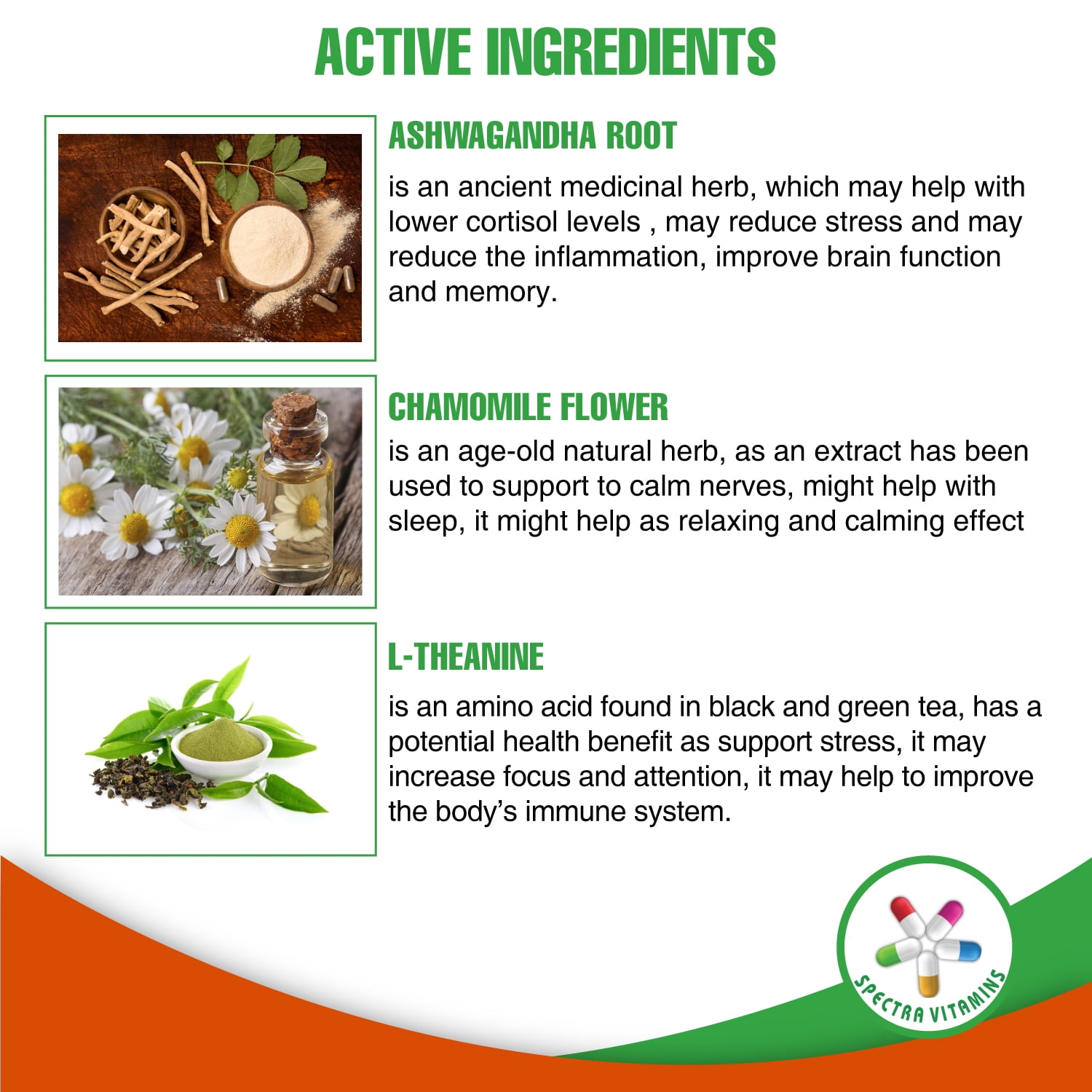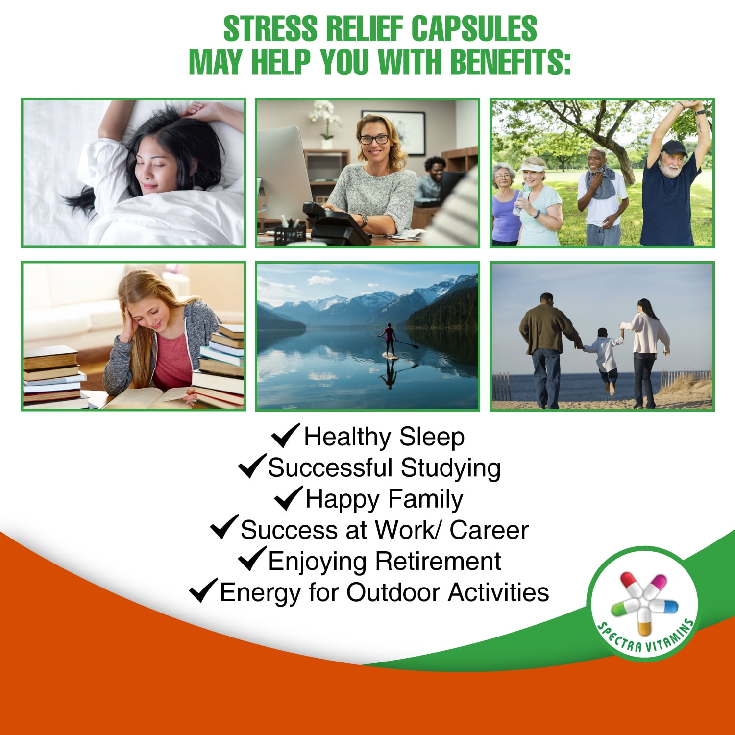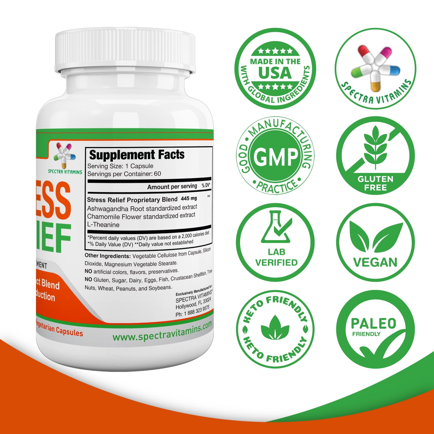 STRESS RELIEF 60 capsules, High Quality Ashwagandha, an ayurvedic herb supplied by premium source to help with the reduction of the stress. Dried Chamomile Flower extract, a natural herb to support calm the nerves and help with sleep. STRESS ON DAILY BASIS due school, work, family? Yes?? They are many like you out there. More people are turning to natural products as Stress Relief formulated with natural herbs by expert with over 35 years of experience. AMINO ACID L-THEANINE to support a better state of mind. The 60 stress relief capsules include L-Theanine, found naturally in green tea may help with increased focus and attention. NATURAL WAY TO FIGHT the daily stress vitamins for men and women to improve their mood, balance the stress and promote relaxation. It will help you to enjoy life more Focused and Calmer for successful lifestyle. TRUSTED BRAND Spectra Vitamins works with professional suppliers, GMP- certified manufactures, third- party laboratories to create a quality products for your well-being and happiness in your work and family environment.STRESS RELIEF capsules are natural remedy with Ashwagandha, L-Theanine and Chamomile. The blend of natural herbs supports reduction of stress, promotes sleep, and helps to calm the mind, 60 capsules,