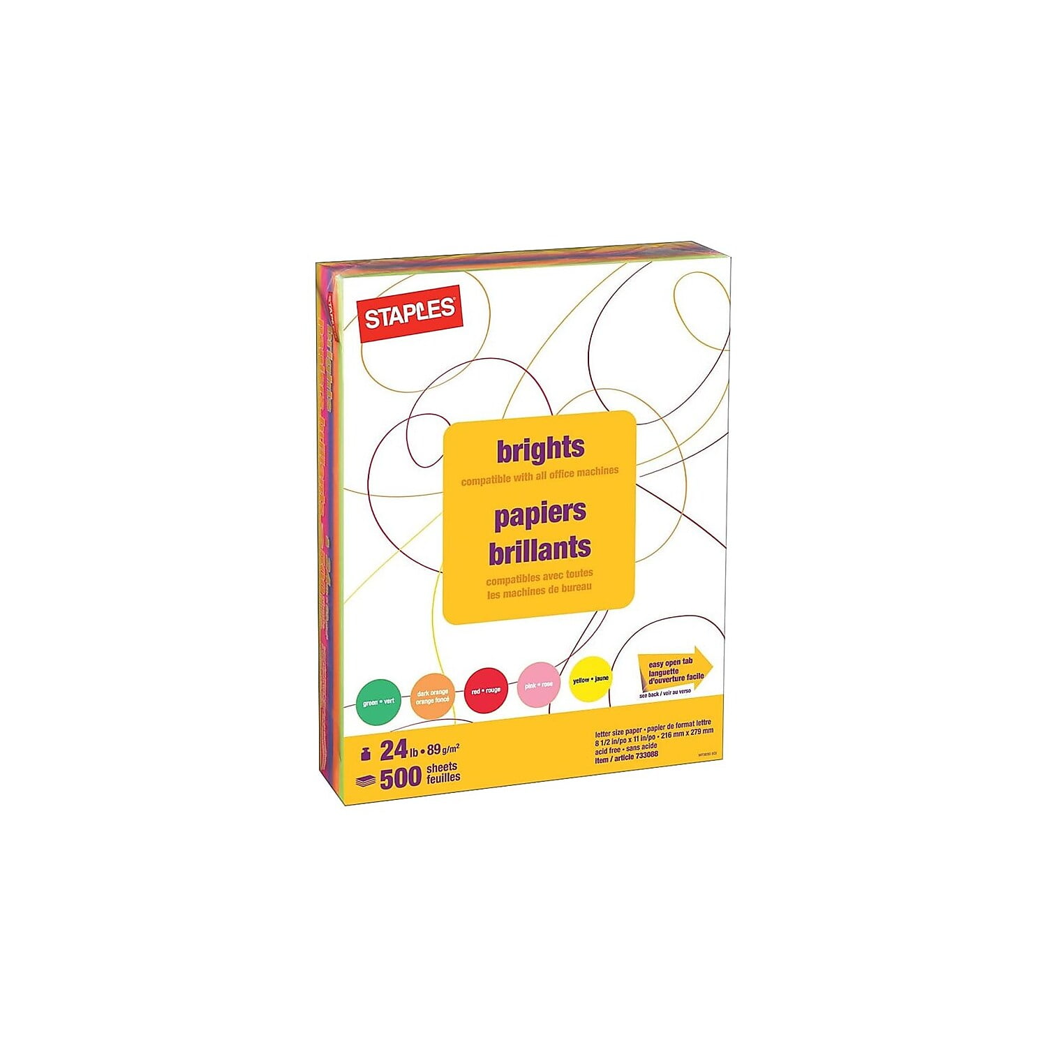 Print fliers, notices and other documents with this Staples Brights assorted color 24-pound paper.Give your printouts a bold look with this assorted color paper. The bright colors are ideal for printing coupons, presentation materials or other types of documents, while the 24-pound paper weight is perfect for paperwork that requires regular handling. These letter-size sheets fit neatly in standard paper trays. This Staples Brights paper boasts acid-free, archive-safe construction to resist fading with time. Reliable multipurpose paper is perfect for everyday use. Paper measuring: 8.5"" x 11"" (US letter). Paper weight: 24 lbs. Bright colored paper is ideal for direct mail, flyers, and office or school projects. Assorted color for an attractive look. Contains 500 sheets per ream. Meets or exceeds FSC standard. Acid-free to keep paper from crumbling or yellowing.Attention Getting ColorNo one misses announcements printed on this paper. The bright assorted shades are visually arresting, so they are the perfect colors to use for creating important safety updates, sign-up sheets and customer advertisements. The color is also cheerful and appealing to brighten up a drab office environment or any work space where children visit.Durable and LastingThis acid-free paper doesn’t deteriorate quickly. Use it to make signs that have to stay posted indefinitely without worry of the need to replace them often. You need only a single thumbtack or piece of tape to hang this lightweight paper on a wall.MultipurposeUse this paper in a multitude of ways. It’s compatible with all office printers. Slip sheets of assorted color paper into stacks of white paperwork to serve as visual markers; use it as scratch paper; include it in decorative bulletin boards or give it to employees’ visiting children to use in art projects. Sold as 500/Ream.