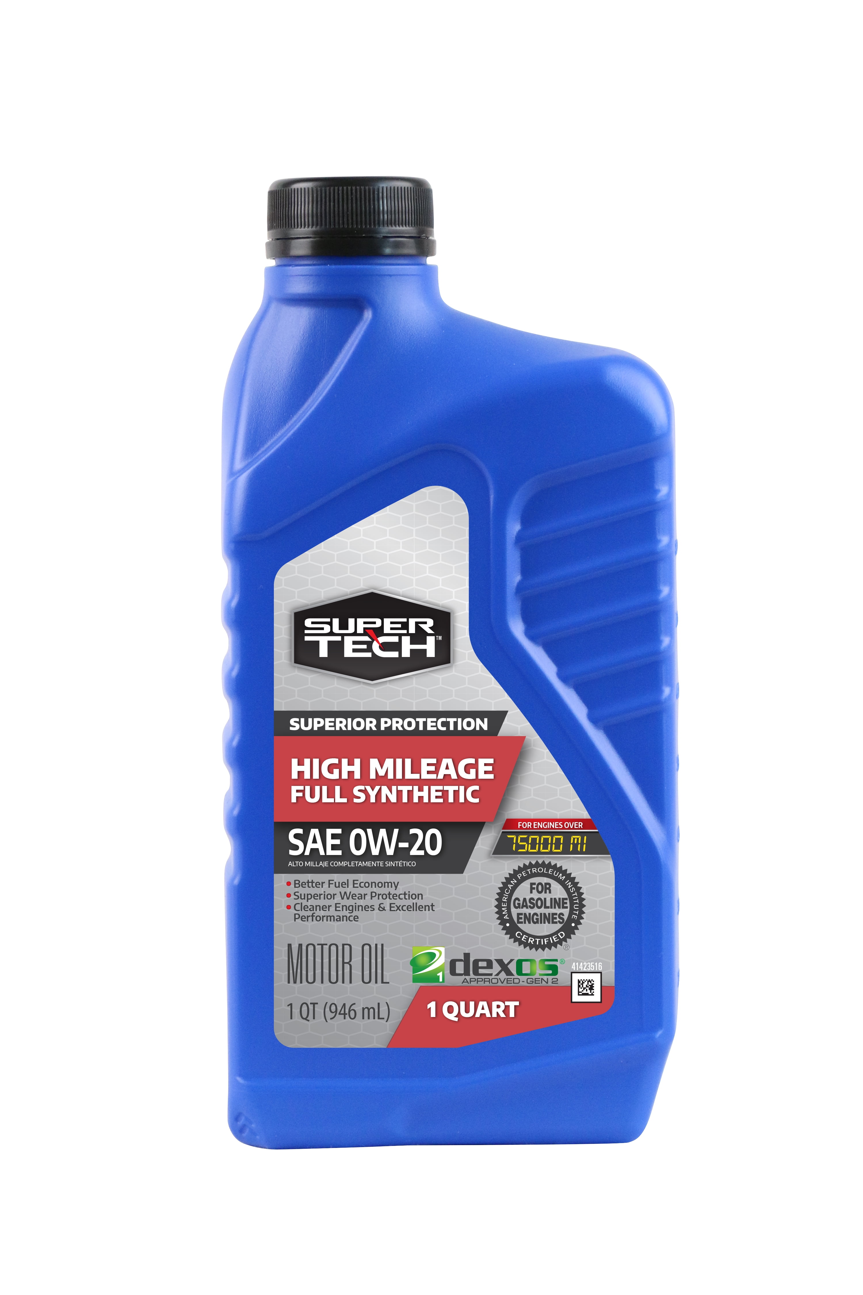 Super Tech High Mileage Full Synthetic 0W-20 Motor Oil offers 10,000 mile superior wear protection to keep your vehicle performing well. Super Tech High Mileage Full Synthetic 0W-20 motor oil comes in a convenient one quart bottle. This Super Tech High Mileage Full Synthetic 0W-20 motor oil is made with a combination of premium base oils and an enhanced additive system to provide increased protection for your engine. It features a high-performance formulation for gasoline engines so that yours can function smoothly and efficiently. This Super Tech motor oil provides 10,000 mile superior wear protection and outstanding resistance to thermal breakdown at operating temperatures. It also helps to reduce harmful deposits and acids that can damage your engine and other components and rob them of their power. Super Tech High Mileage Full Synthetic Motor Oil is compatible with conventional engine oils. Meets or exceeds GM Dexos1 Gen2 specifications for world wide requirements for all GM automotive gasoline engines currently in use. Meets requirements for all gasoline automotive engines currently in use where a SAE 0W-20 that meets API Specifications SP and ILSAC GF-6A or previous standards are specified. Always check manufacturers’ recommendations for proper SAE grade and API classification. Dexos1 Gen2 supercedes GM 6094M and GM4718M. Also available in a 5 quart jug. Pour it in and help your vehicle continue to perform at a high level.