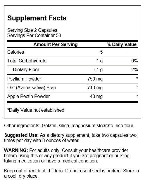 Do the right thing for your heart and your colon; make Swanson Premium Tri-Fiber Complex part of your daily regimen. A good daily supply of dietary fiber is crucial for cardiovascular health and for maintaining normal bowel function. Unfortunately, most of us don’t get enough fiber in our regular diet. That’s where Tri-Fiber Complex can help. This formula makes it easy to get the fiber you need every day by combining psyllium, oat bran and apple pectin in convenient capsules.