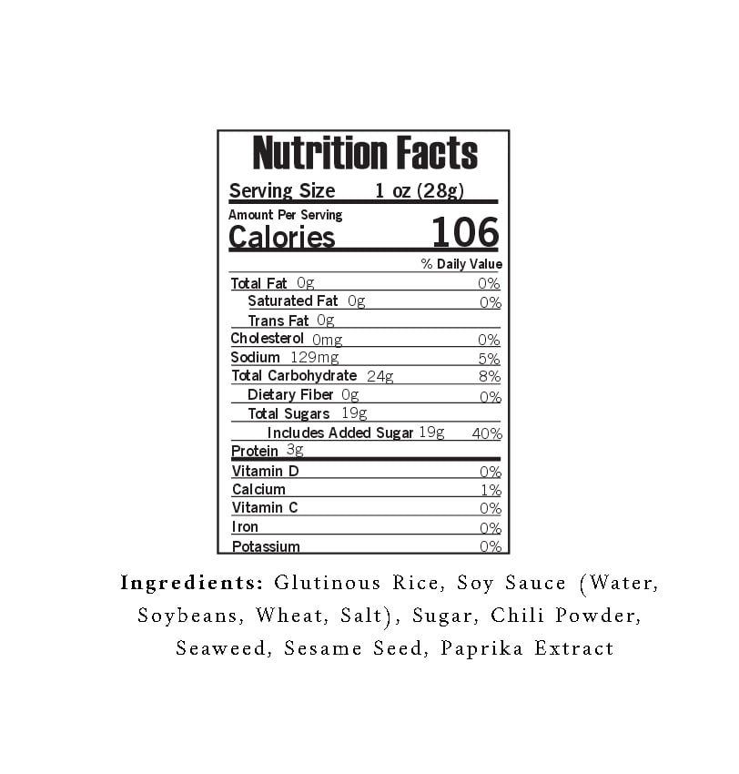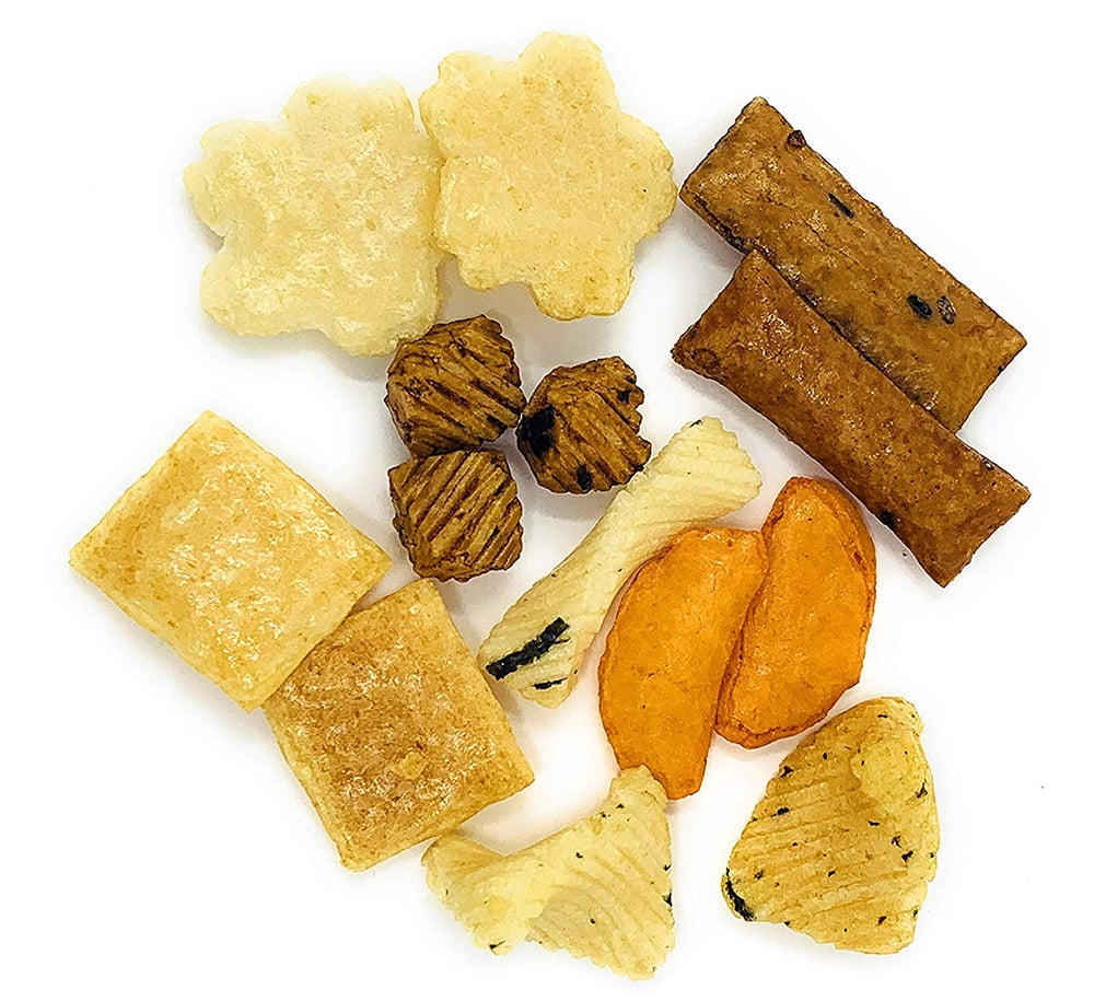 - BUY BULK AND SAVE! Oriental rice crackers contain mostly rice and are flavored with soy sauce, sugar, seaweed and chili. These crackers are relatively low in calories, making them healthier choices than potato chips, cheese crackers or other fatty snacks.