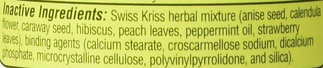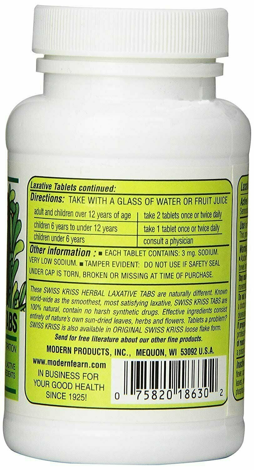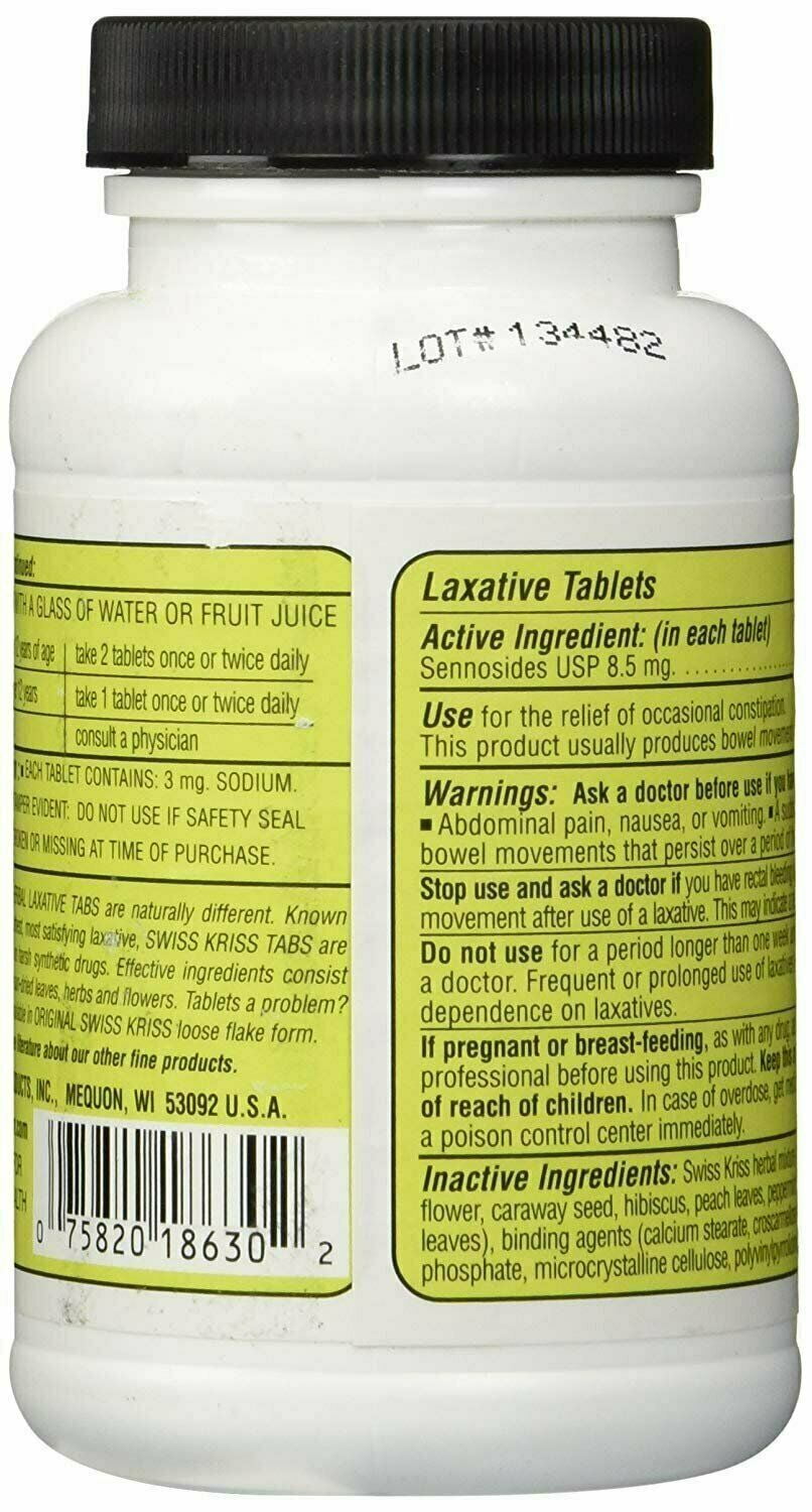 These Swiss Kriss Herbal Laxative Tabs are naturally different, known world-wide as the smoothest, most satisfying laxative, Swiss Kriss Tabs are 100% natural contain no harsh synthetic drugs. Effective ingredients consist entirely of nature’s own sun-dried leaves, herbs, and flowers.Send for free literature about our other fine products.Active Ingredients: Finely Powdered Sun-Dried Leaves of Senna Inactive Ingredients: Finely Powdered Strawberry Leaves, Peach Leaves, Anise Seed, Caraway Seed, Hibiscus Flower (flavoring), Calendula (Calendula Officinalis) Flower (flavoring), Carminative Principles