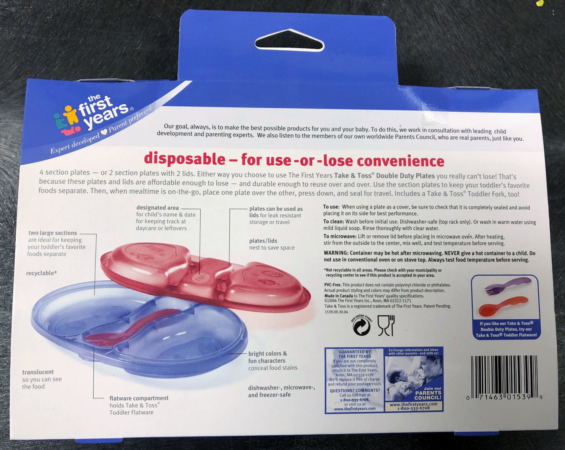 4 Section plates – or 2 section plates with 2 lids! Either way you choose to The First Years Take & Toss Double Duty Plates you really can’t lose. That’s because these plates and lids are affordable enough to lose – and durable enough to reuse over and over. Use the section plates to keep your toddler’s favorite foods separate. Then, when mealtime is on-the-go, place one plate over the other, press down, and seal for travel.