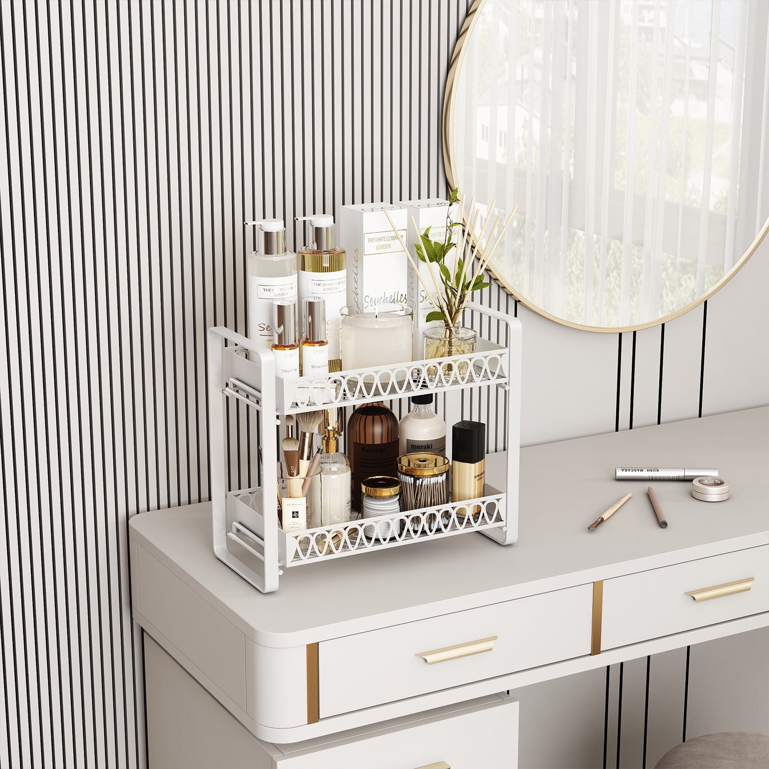 ??MULTIFUNCTIONAL VANITY STORAGE TRAY: TECHVIDA 2 tier bathroom counter organizer is very suitable for storing lotion, cosmetics, nail polish, towels, detergent, soap, shampoo, and can be used as kitchen spice rack for holding fruits, vegetables,glasses, etc.
