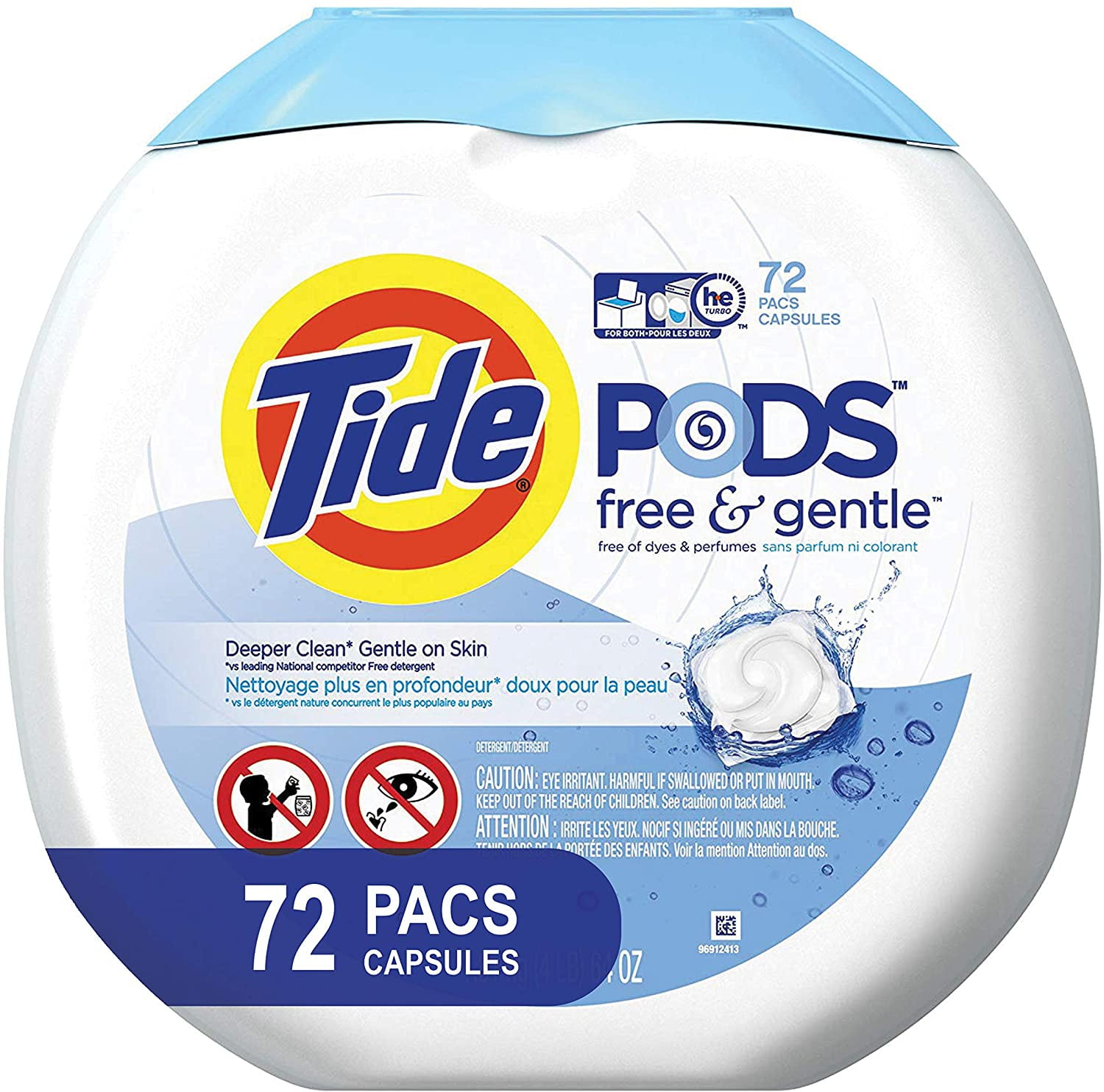 Contains zero dyes and zero perfumes^Provides a deeper clean (versus the leading Free detergent) that’s gentle on skin^Pop in the washer for a perfectly premeasured amount of laundry detergent in any size load, temperature or machine^One of three products in the Free and Gentle Family, which also includes Downy Free fabric softener and Bounce Free dryer sheets^Formulated for both high efficiency (HE) and standard washersHypoallergenic. Dermatologist Tested. Free of dyes and perfumes.3-in-1 laundry pacs: detergent, stain remover, brightener.Each pac of Tide Pods Free & Gentle provides a deeper clean (versus the leading Free detergent) that’s gentle on skin.1 laundry pac for regular loads, 2 pacs for large loads and 3 pacs for extra large loads.Tide PODS laundry pacs dissolve quickly in hot & cold.Tide PODS Free and Gentle is specially formulated with HE Turbo technology that contains quick collapsing suds and targets tough stains.Like any household detergent, keep away from children.Tide Free and Gentle Laundry Detergent Pods, 72 Count, Unscented and Hypoallergenic for Sensitive Skin