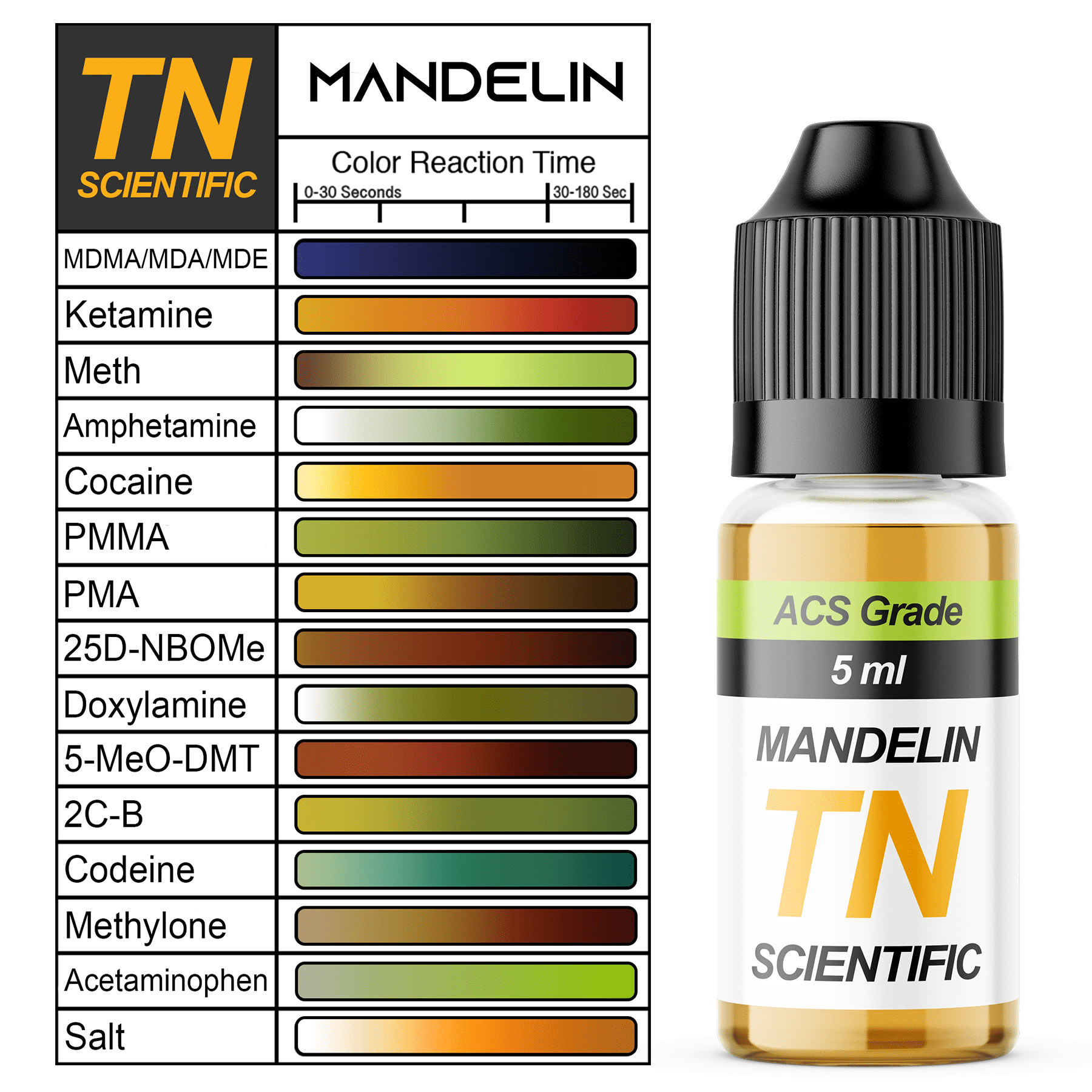 This listing is for a Mandelin Reagent Drug Testing Kit. This kit includes a 5ml bottle of TN Scientific’s Mandelin Reagent, a physical color chart, and a test tube. In chemistry, a reagent or analytical reagent is a substance or compound added to a system to cause a chemical reaction.