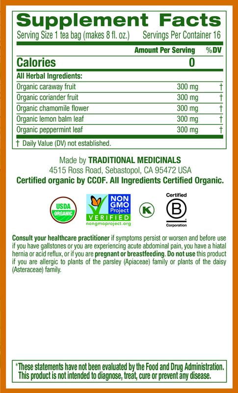 Traditional Medicinals Tea, Organic Gas Relief, Herbal Tea Bags, 16 Count. This traditional formula is an herbal powerhouse of gas-relieving herbs, which have worked to support digestion for thousands of years.* Equal parts of caraway, coriander, lemon balm, chamomile and peppermint combine to make this time-tested blend a cup of soothing relief.* From field to cup, we make sure our teas deliver the benefits of these amazing plants. To deliver consistently high-quality teas, we source organically farmed or organically wild-collected herbs from ethical trading partnerships, seeking out medicinal-grade plants. Only a small fraction of the world’s herb supply meets our high-quality standards.