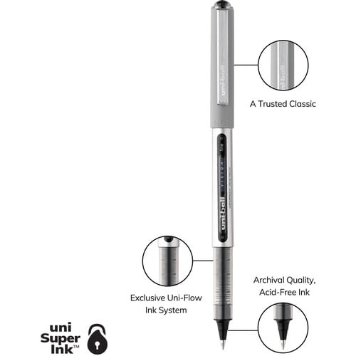 Vision Rollerball Pen features an innovative system that regulates a steady flow of waterproof ink to the point for consistent smoothness and color intensity. Exclusive uni-Flow Free Ink System ensures a consistent, delightfully silky smooth writing experience. The uni Super Ink technology protects against water, fading and fraud. Sturdy point is quiet and responsive. Uncapped pen offers a visible ink supply. Pen is nonrefillable.