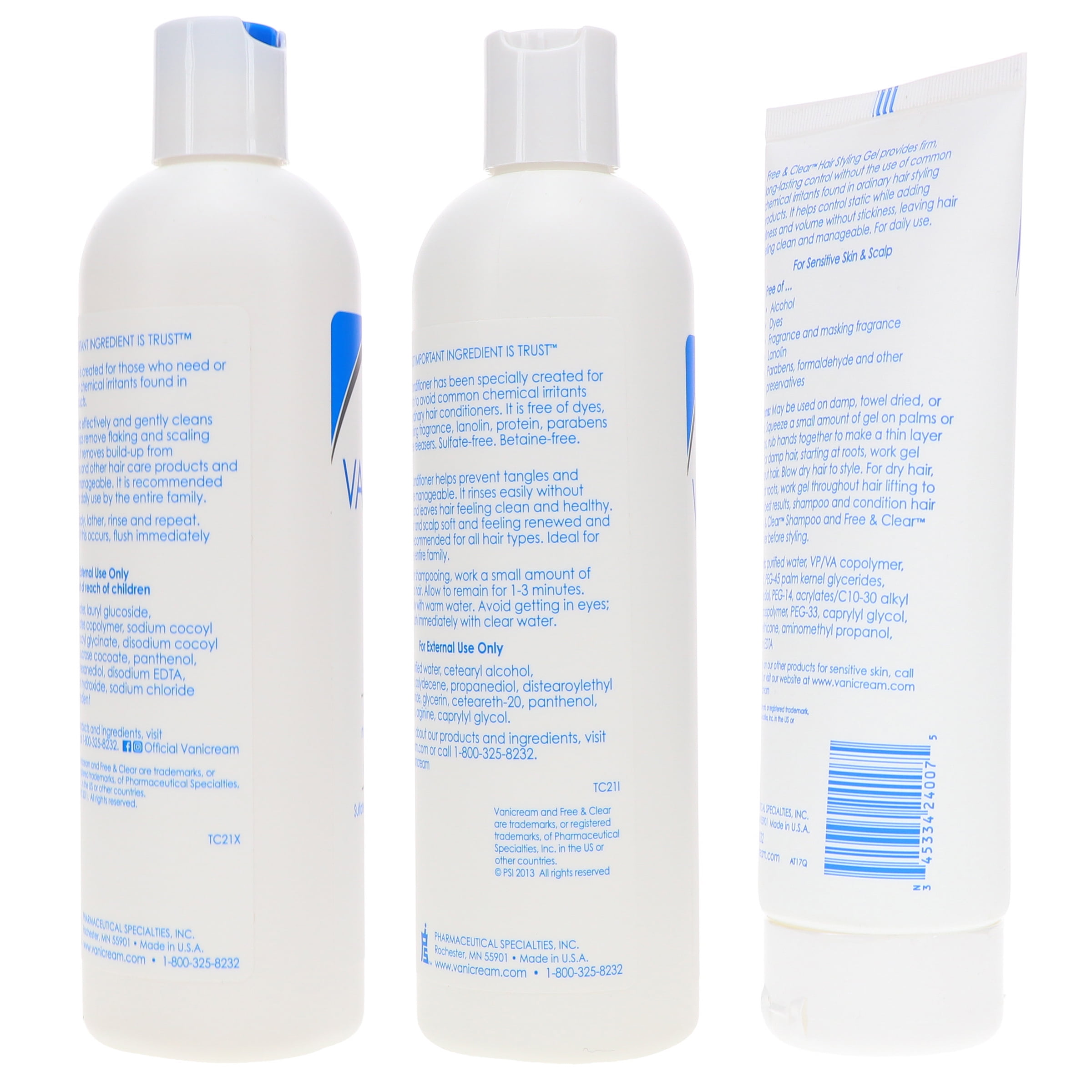 Vanicream/Free & Clear Shampoo 12 oz, Conditioner 12 oz & Styling Gel 7 oz Combo Pack