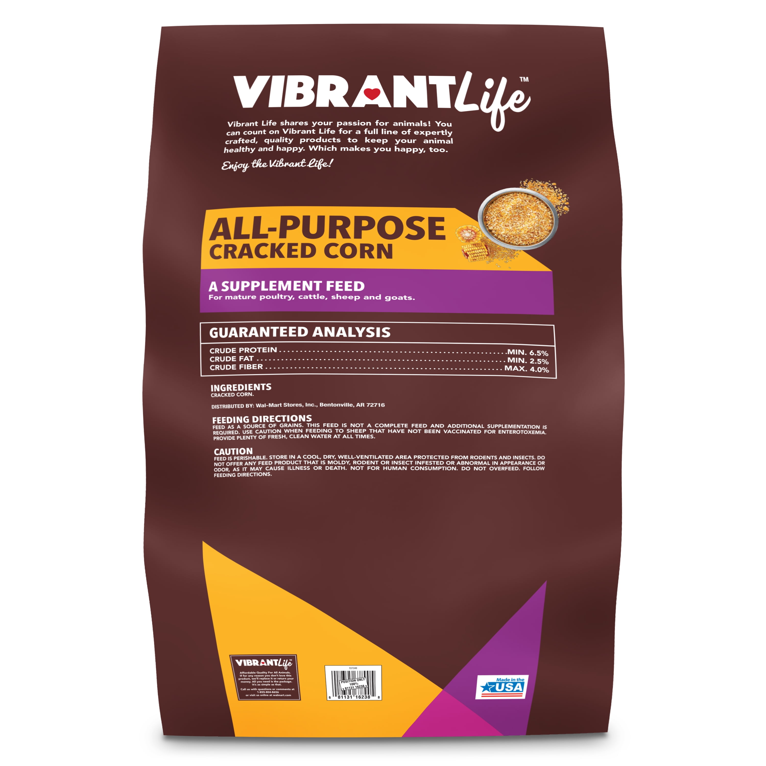 Provide animals with the supplemental nutrition they need with the Vibrant Life All Purpose Cracked Corn. The corn is cracked to improve digestibility for all your animals and is a high-energy source to help keep them moving along. With 40 pounds of feed per bag, you’ll have plenty of supplements to go around and ensure everyone is getting a proper, healthy diet. Saddle up and bring home a bag of Vibrant Life All-Purpose Cracked Corn.