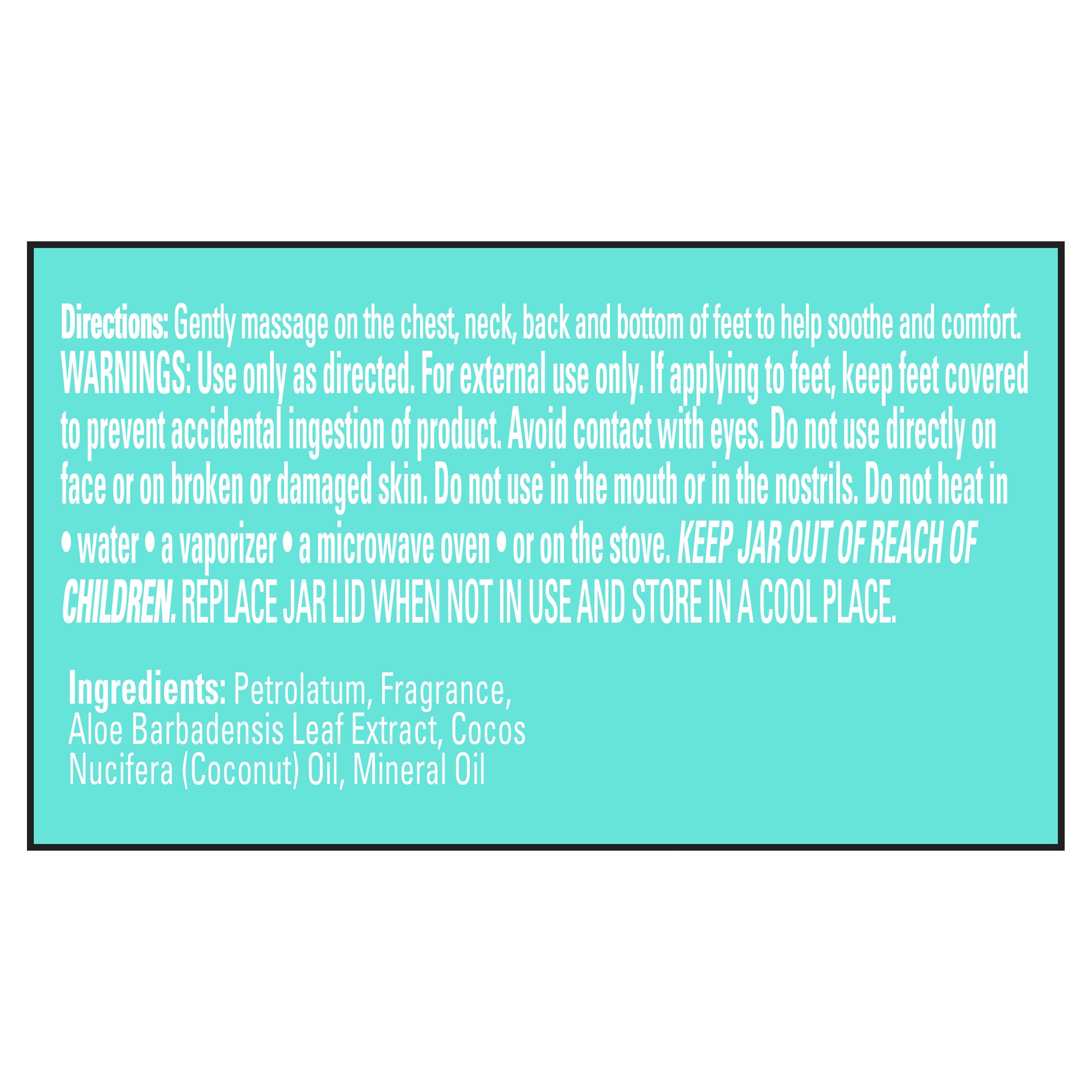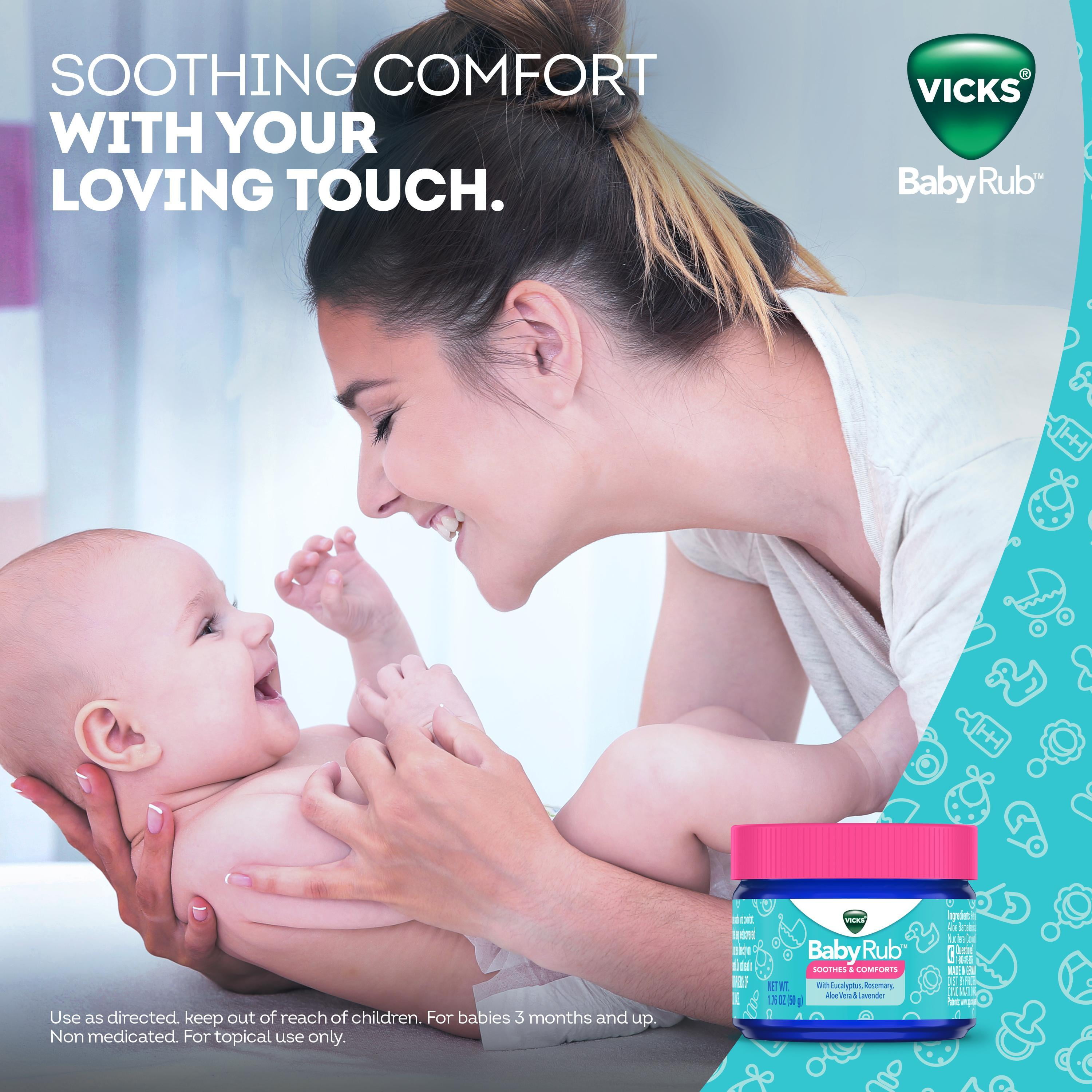 From the makers of the world’s best-selling Vicks VapoRub comes a product specially designed for the youngest members of your family: Vicks BabyRub. As a parent, you want to do everthing you can to soothe and comfort your baby. This gentle Vicks BabyRub formula is non-medicated and specially formulated for babies aged 3 months and older. It is formulated with petrolatum and aloe vera to leave your baby’s skin feeling soft and comfortable. Vicks BabyRub contains the aromatic fragrances of Eucalyptus, Rosemary, and Lavender. Combined with your loving touch, it’s the perfect ointment to calm, soothe, and relax your baby. From the makers of Vicks VapoRub. For use on babies 3 months and older. Gently massage the soothing, non-medicated ointment on your baby’s chest, neck, and back to help soothe and comfort. Ointment contains Petrolatum, Fragrance, Aloe Extract, Eucalyptus Oil, Lavender Oil, and Rosemary Oil.BabyRub is non-medicated. Not intended to treat cold or flu symptoms.