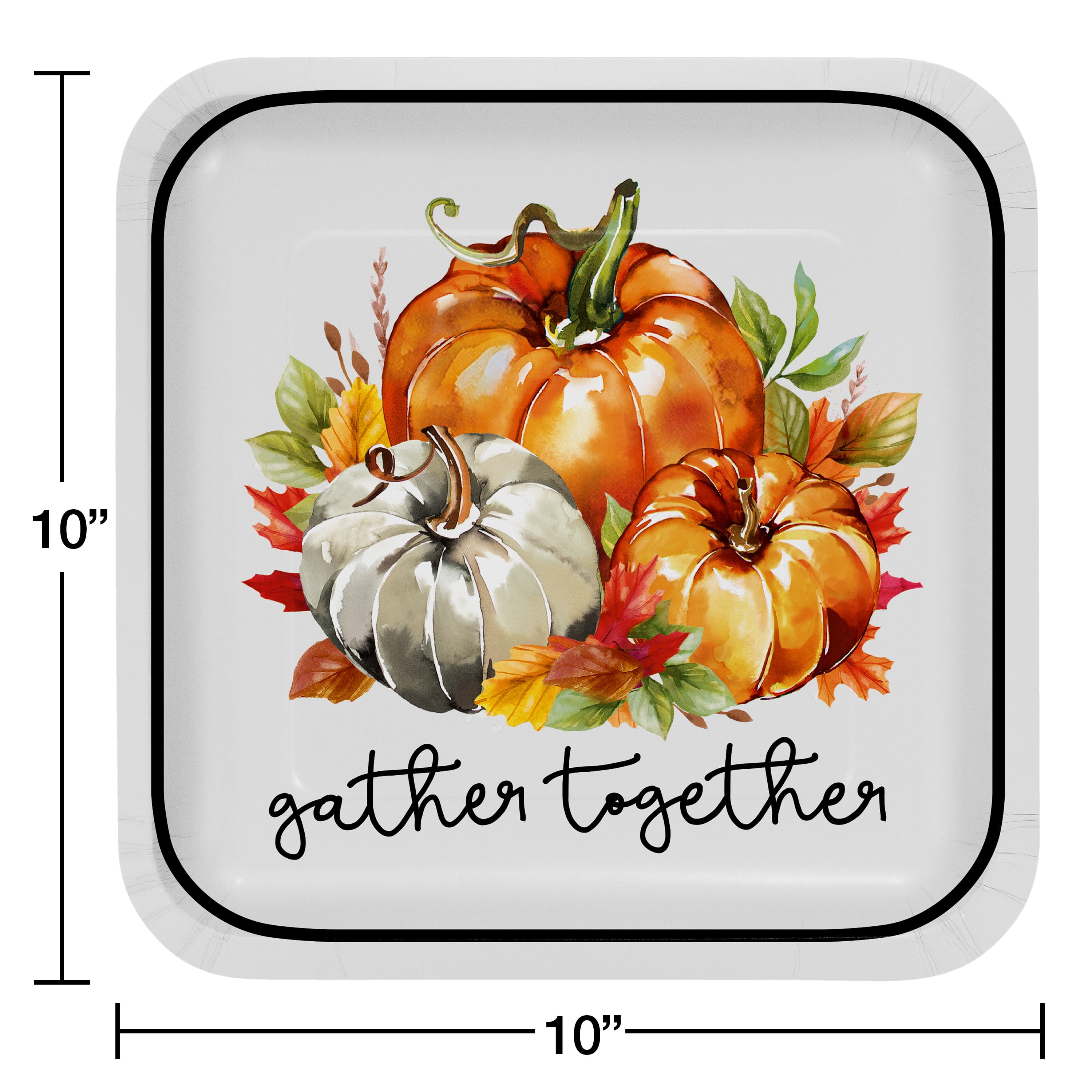 Thanksgiving is all about coming together, and the Way to Celebrate Traditional Thanksgiving Paper Plates, 10 ct, will make your gathering even more special. Each package includes 10 paper plates measuring 10" that have an oversized square shape. Featuring pumpkins illustrated against a white background with the headline “Gather together,” these paper plates can be paired with any other Thanksgiving party supplies. Sold in packs of 10, grab yours today.• Each package includes Way to Celebrate Traditional Thanksgiving Paper Plates, 10 ct. The square paper plates measure 10" and feature the headline “Gather together” alongside pumpkins. These sturdy paper plates are strong enough to hold a generous serving of turkey and all the sides. Perfect for a Thanksgiving party, these disposable plates are on-trend and make clean-up a breeze wherever you’re celebrating. • Also, be sure to check out the other items from our wide selection of party supplies including additional decorations and tableware for all of your serving needs.