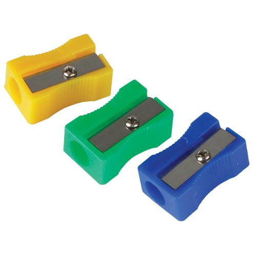 Classic plastic sharpeners with a single hole. Brightly colored sharpeners feature ribbed finger grooves for gripping. 25 per package,colors may vary.Classic plastic sharpeners with a single hole. Brightly colored sharpeners feature ribbed finger grooves for gripping. 25 per package, colors may vary.