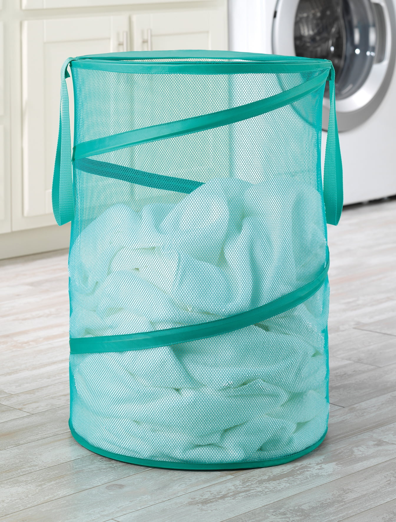 - The Whitmor Collapsible Laundry Hamper, is a wonderful addition to your wash day. It is made of a high-quality polyester mesh for lasting strength. Being a collapsible laundry hamper, it can be easily folded and stored away when not in use. The slit top design makes it easy for you to put in the dirty clothes and access them for laundering whenever required. This mesh laundry hamper is designed with straps to facilitate easy carrying. The stain-resistant polyester laundry hamper is washable.