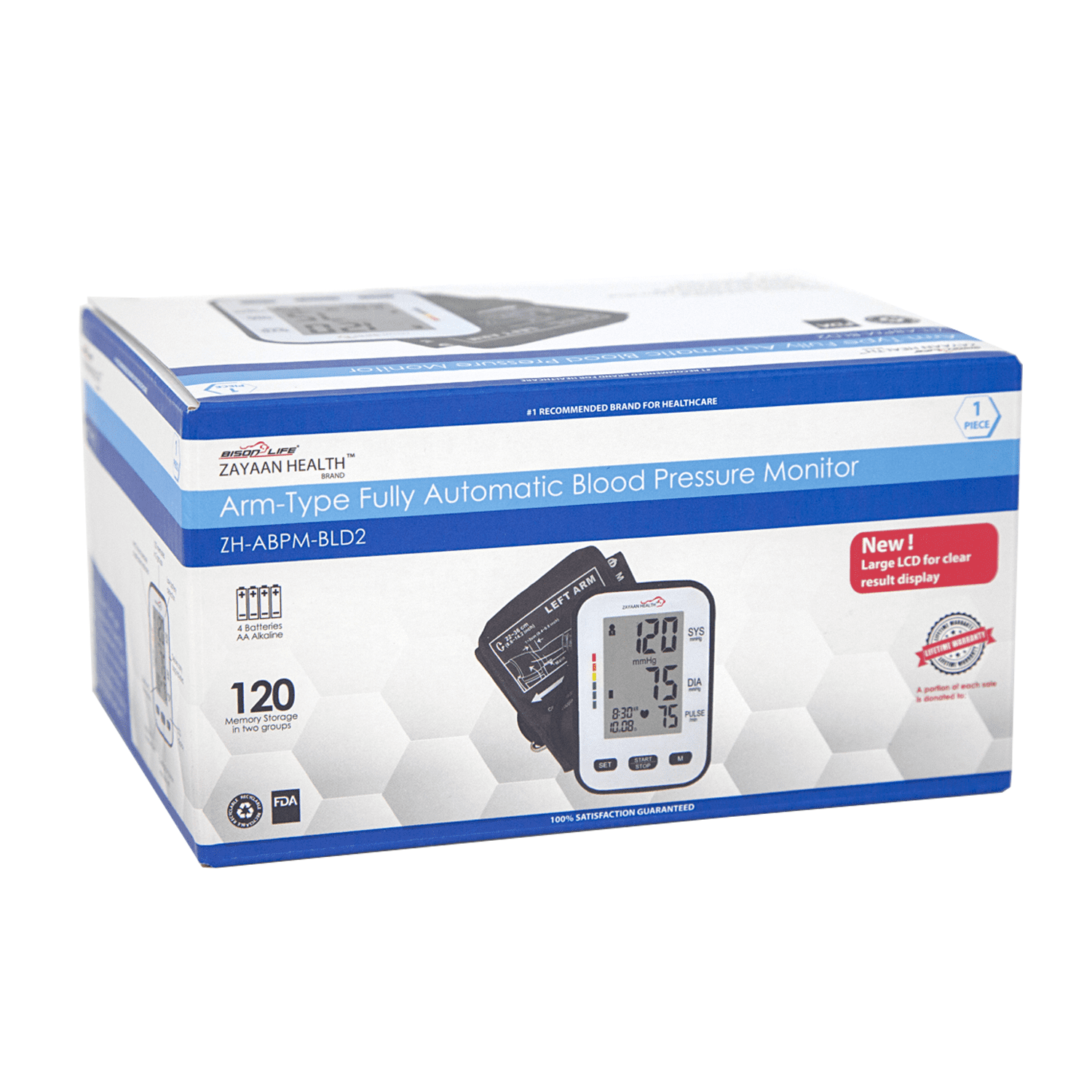 ZAYAAN HEALTH Arm-type Fully Automatic Blood Pressure Monitor is designed with 120 memory storage in two groups with date and time display included. This allows multiple users to save individual test results. The front display is equipped with a WHO blood pressure classification indicator based on established guidelines from the World Health Organization. The chart indicates clear, accurate test results with a high-tech measurement color scale. This Blood Pressure Monitor has an automatic shut off function and low battery detection so you’re confident your battery isn’t low. The comfortable latex-free cuff is soft and easy to adjust with hook and loop closure for a perfectly snug fit. Deluxe carrying bag is included to protect your blood pressure monitor when on the go. 4 AA alkaline batteries included.