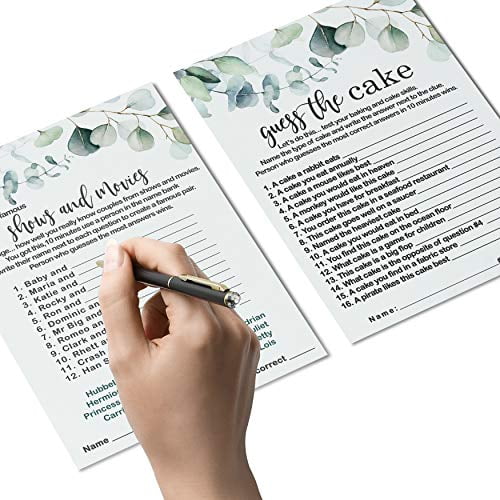 Greenery Bridal Shower Game Card Bundle (25 Guest Pack) Includes Word Scramble, Guess the Cake, Wedding Name, Famous Couples Trivia – Rustic Event Theme – Engagement, Rehearsal, Reception (5×7 Size)