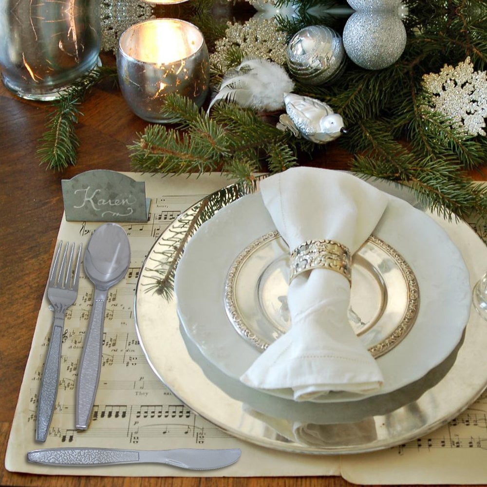 - Add some style and class to all of your parties and events with these high quality disposable silver hammered cutlery set. Pack includes 100 silver hammered design spoons.
