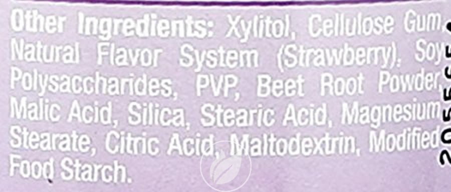 Xylitol, cellulose gum, soy polysaccharides, maltodextrin, dextrose, crospovidone, modified food starch, silicon dioxide, malic acid, natural flavor, stearic acid, beet root extract, magnesium stearate, citric acid.