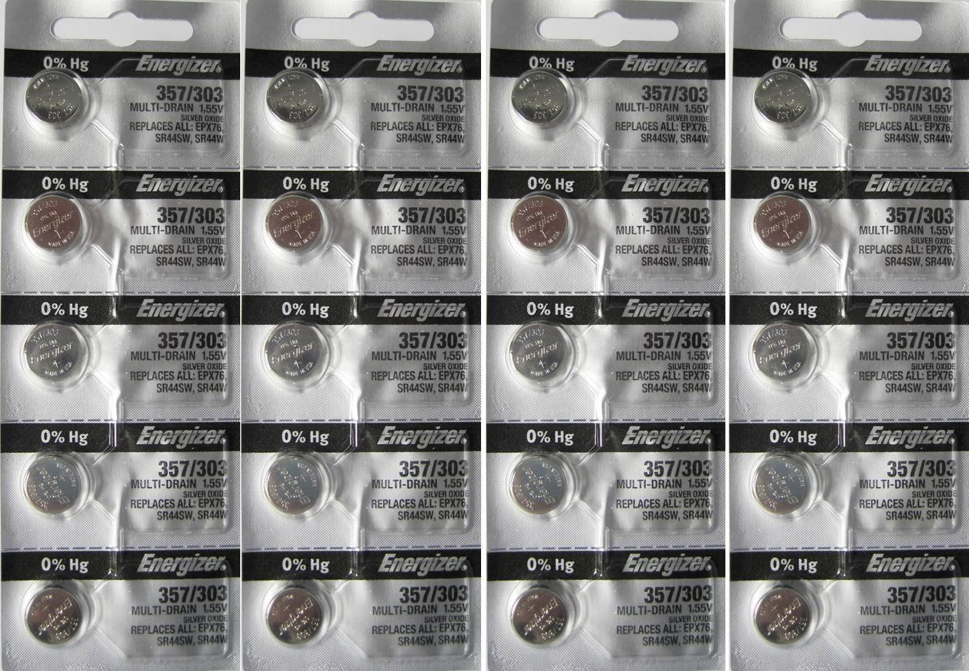 20 energizer 357/303 multi-drain zero mercury batteriesSuper fresh genuine Energizer 357/303 1.55v Watch batteries. Works for: Watches, computer motherboards, calculators, PDAs, electronic organizers, garage door openers, toys, games, door chimes, pet collars, LED lights, sporting goods, pedometers, calorie counters, stopwatches and medical devices and all other devices that requires this battery size. Equivalent to: SR44W, SR44, SR1154, SB-B9, 280-62, V357, D357, 228, S1145E, GP357, AG13, 357, CA18, SG13, EPX76, 10L14, A357, 357X, 357A, D357H, MS76, V76XP, S76E, 357/303, MS76, AG357, SR1154PW, EXP76, E357, E357/303EN,