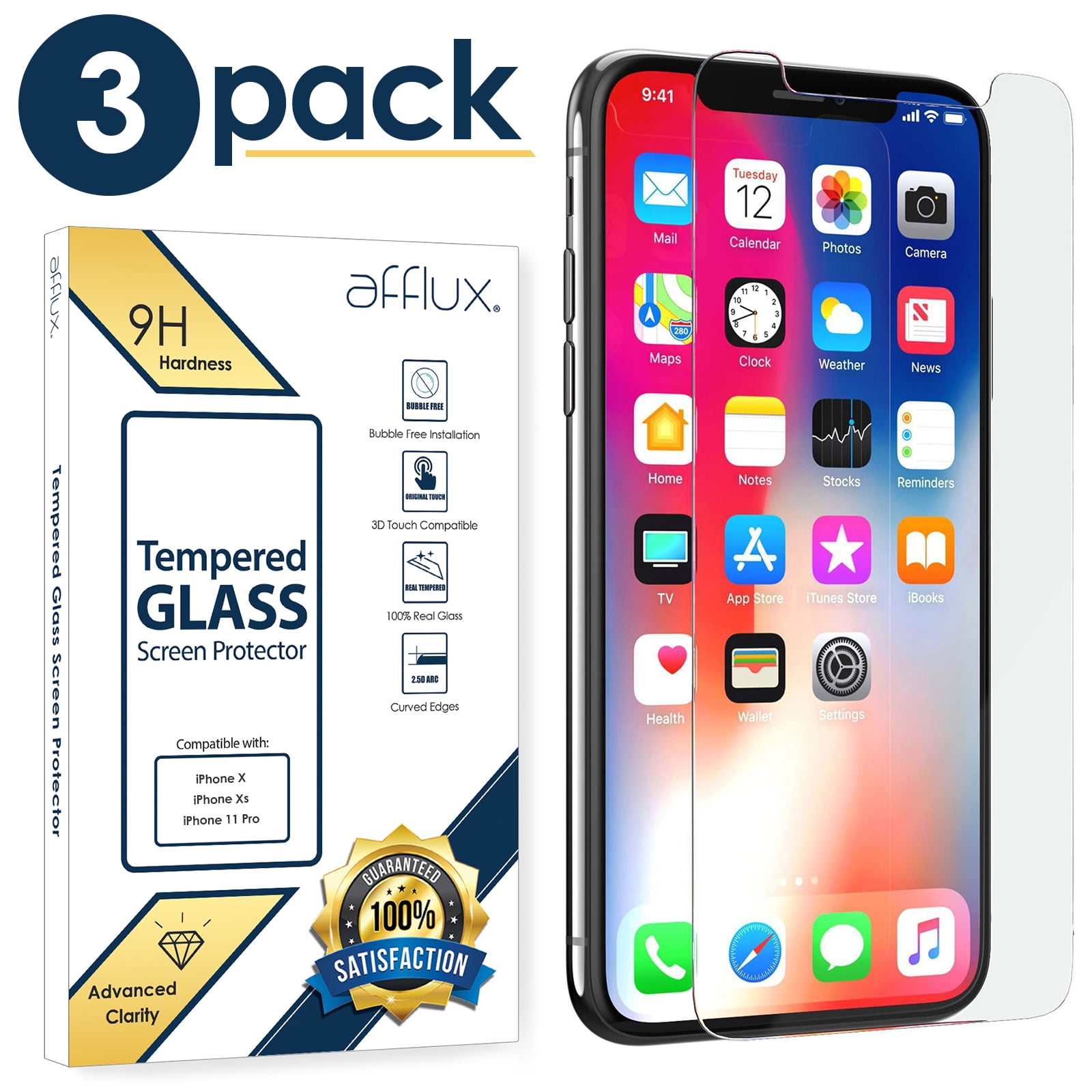 [3-PACK] TTECH For Apple iPhone 11 Pro / X Tempered Glass Screen Protector Film Cover, Anti-Scratch, Anti-Fingerprint, Bubble Free, 100% Clear, HD, In Retail Package [fits iPhone X / XS / 11 Pro]