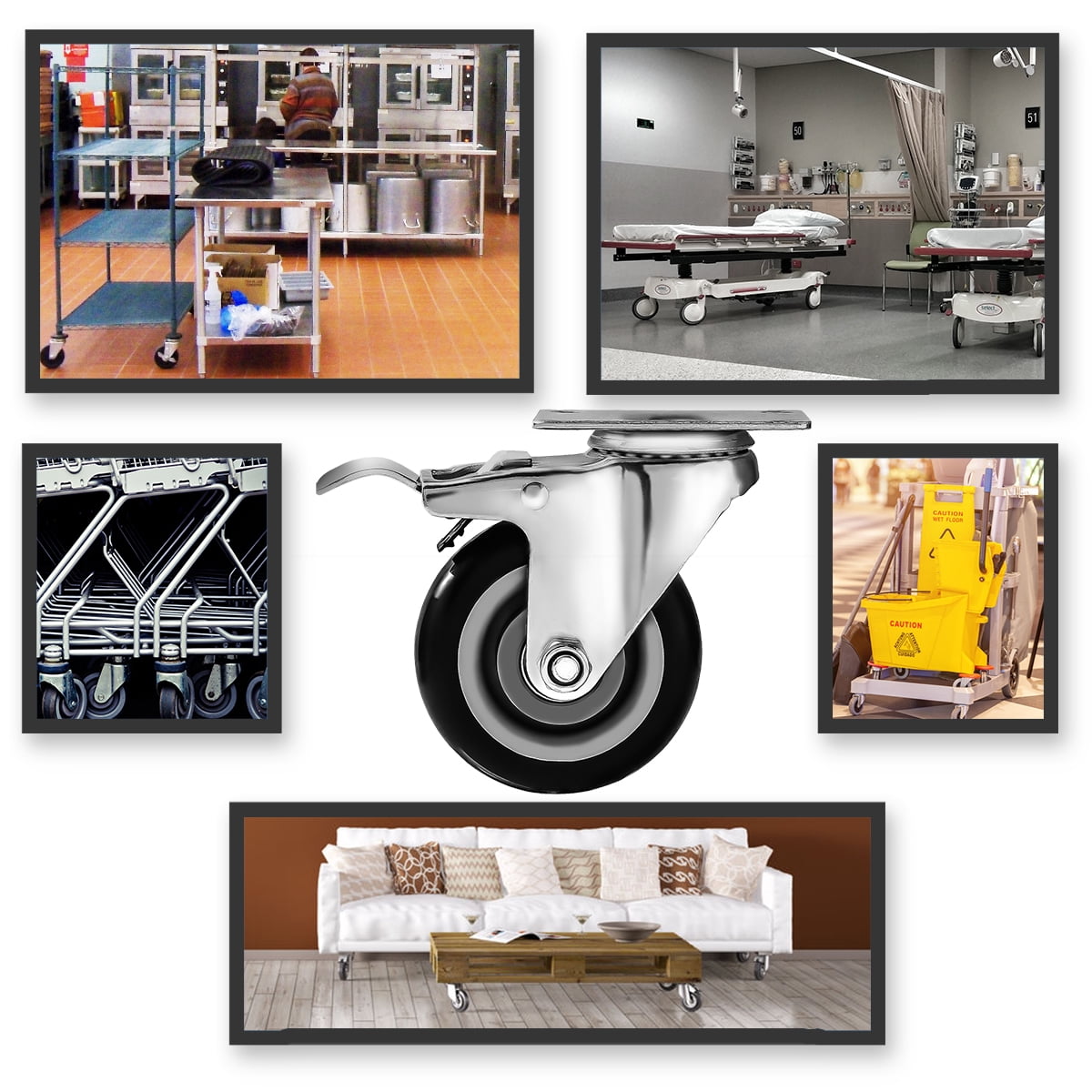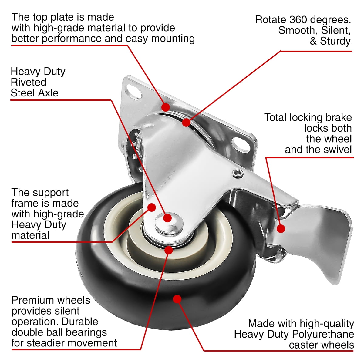 WHEEL MATERIALS AND PERFORMANCE: Heavy duty casters made of polyurethane wheels. COLOR: Black. Ball bearings: Double ball bearings. Premium Caster wheels are made of high quality polyurethane wheels with strong abrasion resistance, silent shock absorber, wearproof, no drag marks and enhance the impact resistance of the whole caster.
