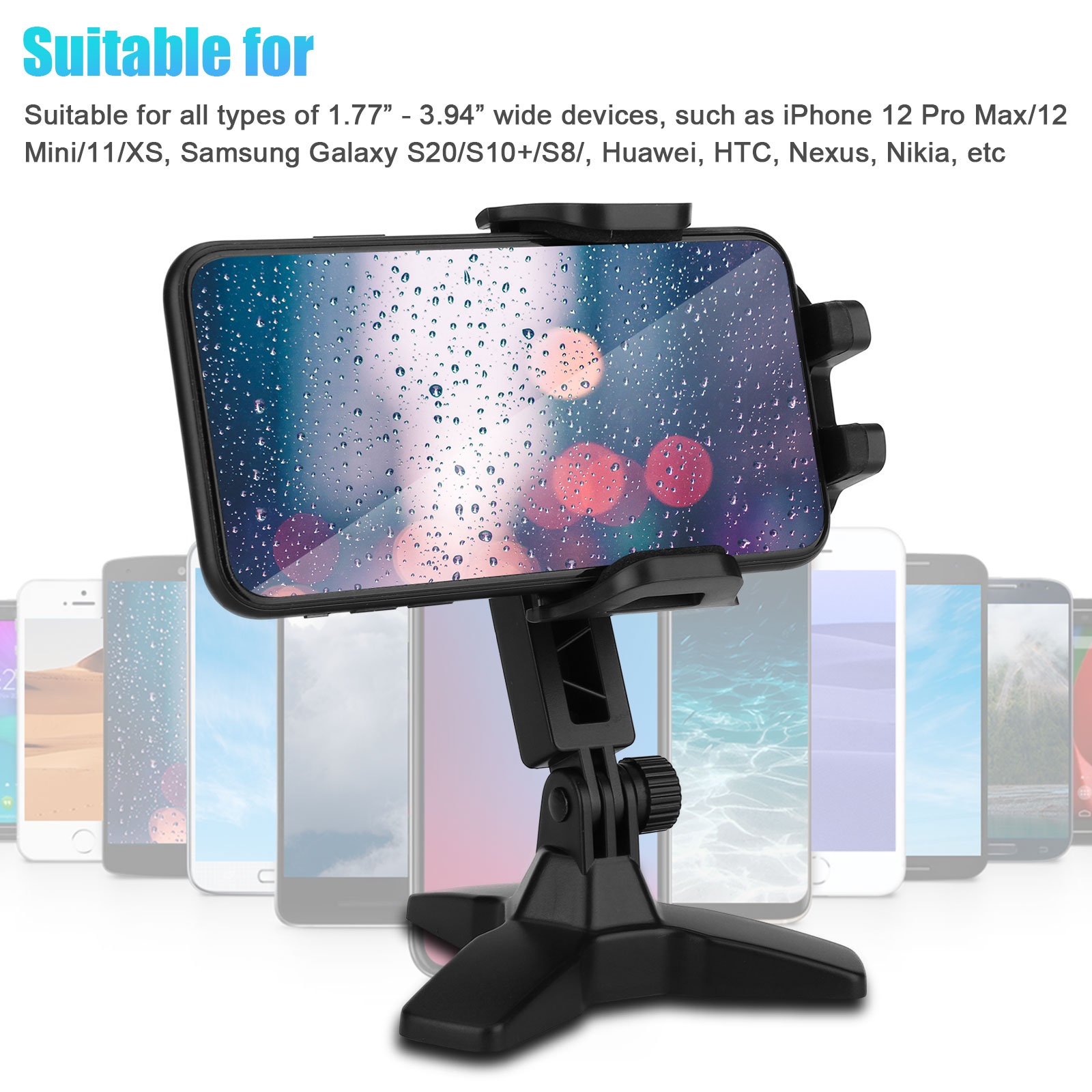 TSV Desktop phone holder has a unique tripod base with an additional metal counterweight to securely mount your phone or device on your desk, table, counter, or other surfaces. When you use your phone or adjust the stand, the non-slip silicone feet keep the stand firmly in place and won’t slip easily. The 360-degree rotation feature provides the best angle for this heavy-duty phone stand, allowing people to place the device in portrait or landscape orientation. This makes it easier for you to watch videos and movies on your phone. And the cell phone stand features a one-button-release curved arm, all with soft sponge pads. Firstly, that protects your phone without scratches. Secondly, that holds your phone securely. Besides, the open-access design allows you to easily charge your phone in the phone holder. TSV Adjustable cell phone stand for desk fits all 1.77" – 3.94" wide smartphones, such as iPhone 13/ 13 Mini/ 13 Pro/ 13 Pro Max/ 12 Pro Max/ 12 Mini/ 11/ XS/ XR/ 8/ 7 Plus, Samsung Galaxy S21/ S21+/ S21 Ultra/ S20/ S10+/ S9 Plus/ S8/ Note 20, Huawei, HTC, LG, MOTO, Google Pixel, Nexus, Nikia, etc.