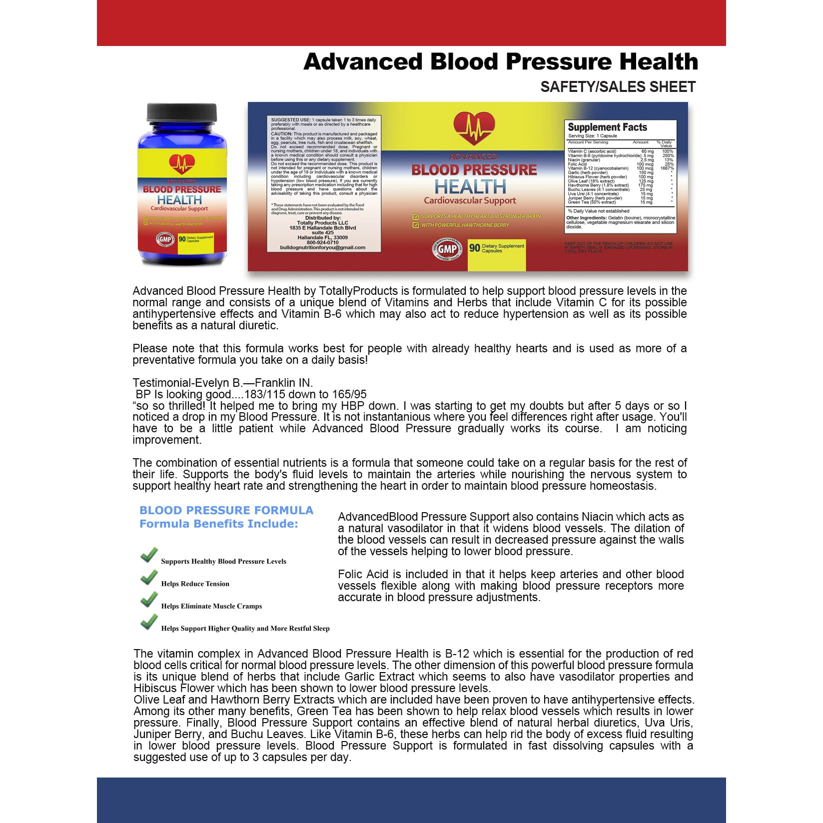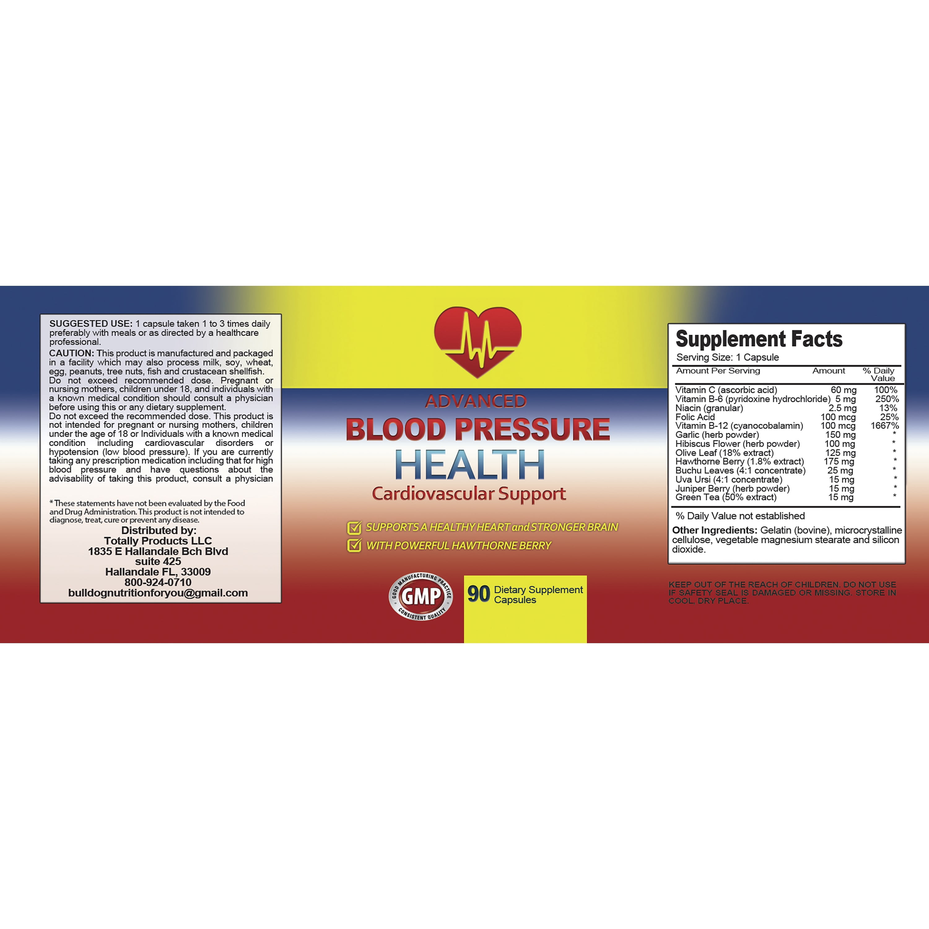 Advanced Blood Pressure Health by TotallyProducts is formulated to help support blood pressure levels in the normal range and consists of a unique blend of Vitamins and Herbs that include Vitamin C for its possible antihypertensive effects and Vitamin B-6 which may also act to reduce hypertension as well as its possible benefits as a natural diuretic.Advanced Blood Pressure Health by TotallyProducts is formulated to help support blood pressure levels in the normal range and consists of a unique blend of Vitamins and Herbs that include Vitamin C for its possible antihypertensive effects and Vitamin B-6 which may also act to reduce hypertension as well as its possible benefits as a natural diuretic.Please note that this formula works best for people with already healthy hearts and is used as more of a preventative formula you take on a daily basis.Testimonial-Evelyn B.Franklin IN.BP Is looking good….183/115 down to 165/95, so so thrilled. It helped me to bring my HBP down. I was starting to get my doubts but after 5 days or so I noticed a drop in my blood pressure. It is not instantanious where you feel differences right after usage. You’ll have to be a little patient while Advanced Blood Pressure gradually works its course. I am noticing improvement.The combination of essential nutrients is a formula that someone could take on a regular basis for the rest of his or her life. It supports the body’s fluid levels to maintain the arteries while nourishing the nervous system to support healthy heart rate and strengthening the heart in order to maintain blood pressure homeostasis.Blood Pressure Formula benefits include:Supports healthy blood pressure levelsHelps reduce tensionHelps eliminate muscle crampsHelps support higher quality and more restful sleepAdvancedBlood Pressure Support also contains niacin which acts as a natural vasodilator in that it widens blood vessels. The dilation of the blood vessels can result in decreased pressure against the walls of the vessels helping to lower blood pressure. Folic acid is included in that it helps keep arteries and other blood vessels flexible along with making blood pressure receptors more accurate in blood pressure adjustments.The vitamin complex in Advanced Blood Pressure Health is B-12 which is essential for the production of red blood cells critical for normal blood pressure levels. The other dimension of this powerful blood pressure formula is its unique blend of herbs that include garlic extract which seems to also have vasodilator properties and Hibiscus flower which has been shown to lower blood pressure levels.Olive leaf and Hawthorn berry extracts which are included have been proven to have antihypertensive effects. Among its other many benefits, green tea has been shown to help relax blood vessels which results in lower pressure. Finally, Blood Pressure Support contains an effective blend of natural herbal diuretics, Uva Uris, Juniper Berry, and Buchu Leaves. Like Vitamin B-6, these herbs can help rid the body of excess fluid resulting in lower blood pressure levels. Blood Pressure Support is formulated in fast dissolving capsules with a suggested use of up to 3 capsules per day.Quantity: 90 capsulesActive ingredients: Vitamins, herbs, vitamin C, vitamin B-6, folic acid, vitamin B-12, gralic extract, Hibiscus flower, olive leaf, Hawthorne berry extracts, gren tea, Uva uris, juniper berry, Buchu leaves, niacinAdvanced Blood Pressure Cardiovascular Support (90 Capsules)