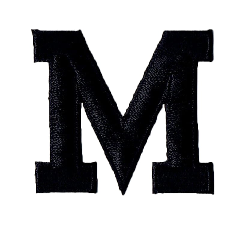 Block style embroidered alphabet letter measures 2" tall, width varies by letter.Alphabet Letter – M – Color Black – 2" Block Style – Iron On Embroidered Applique Patch