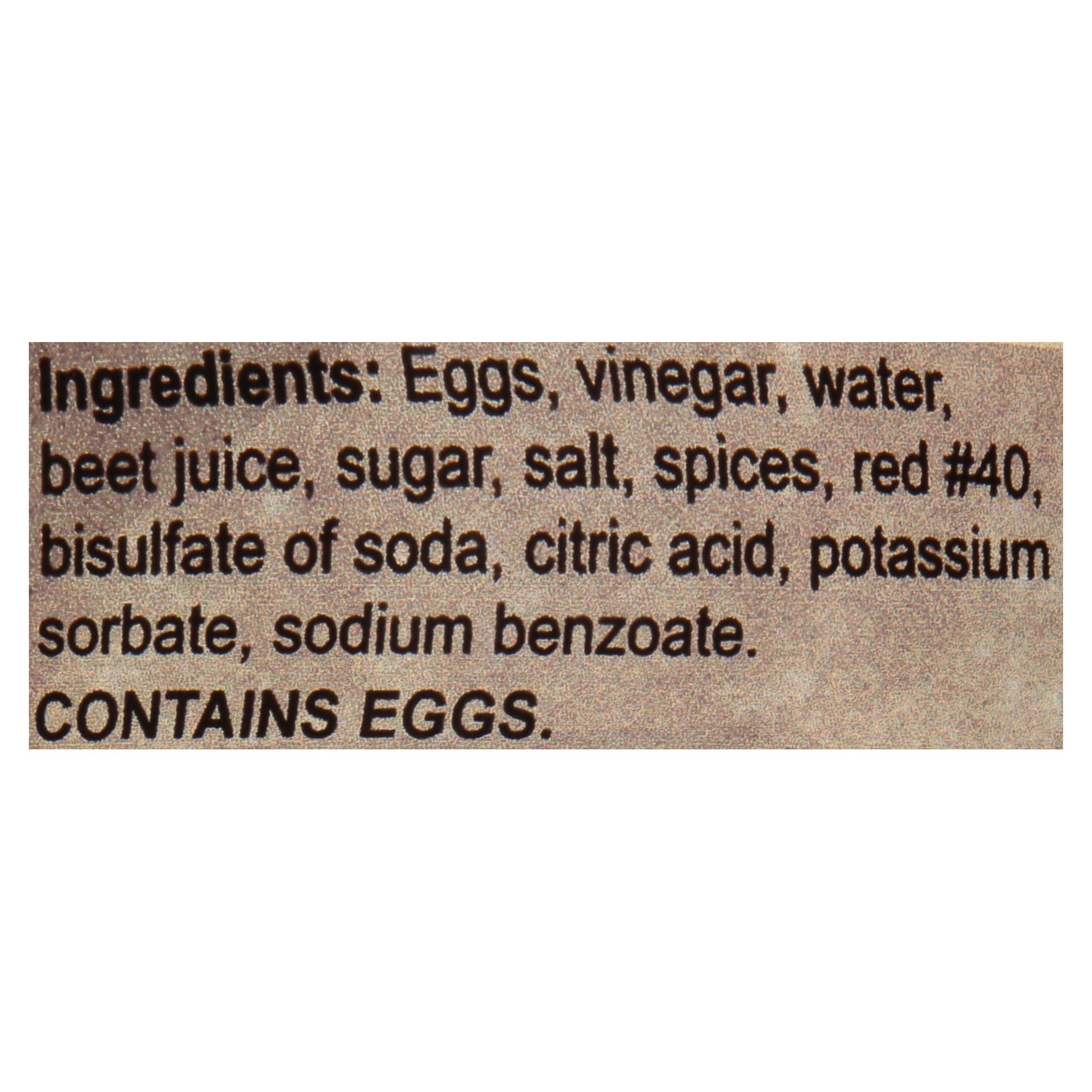 - USA made in OhioIngredients: Contains eggs, vinegar, water, beet juice, sugar, salt, spices, red #40, bisulfate of soda.