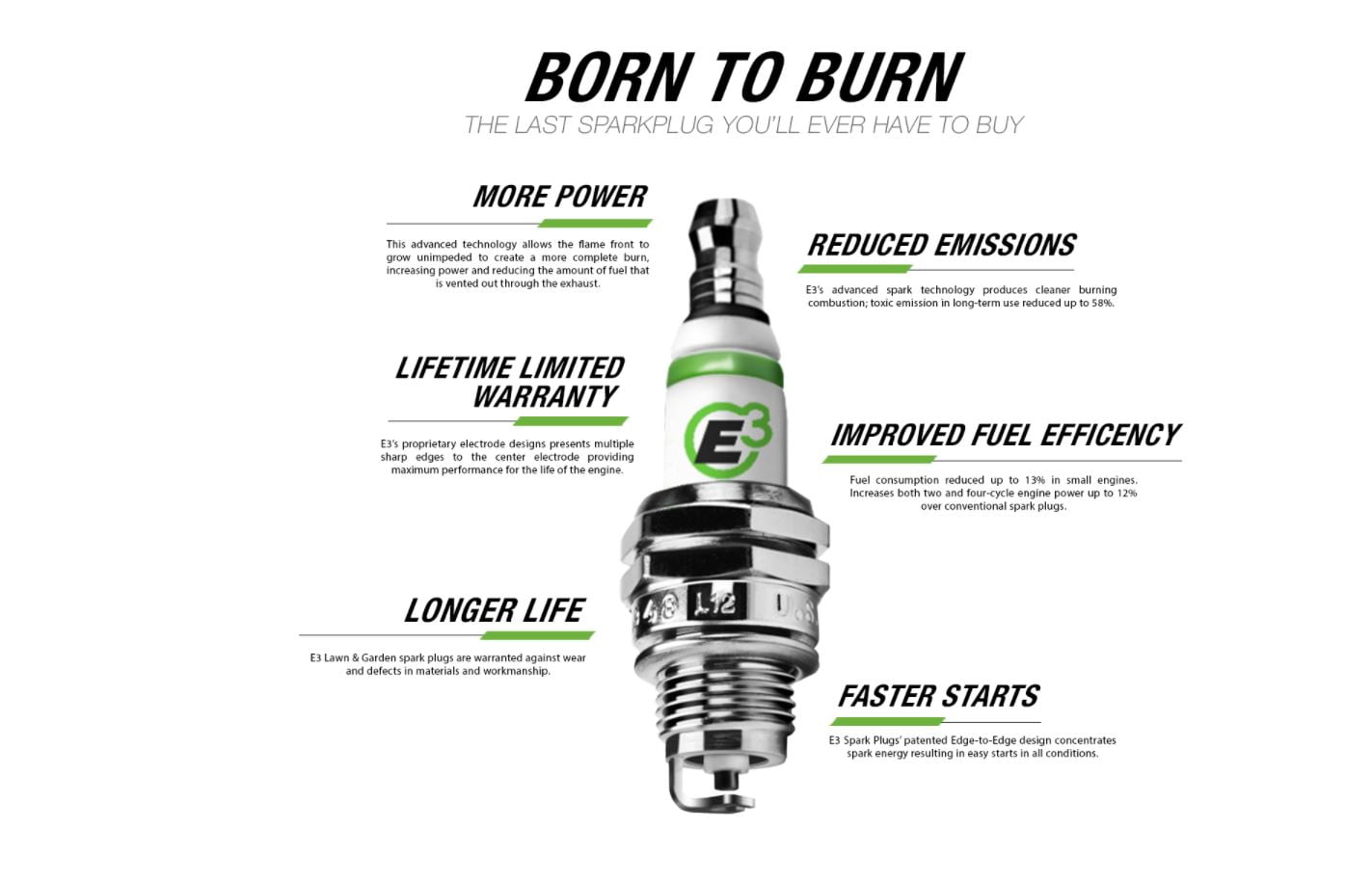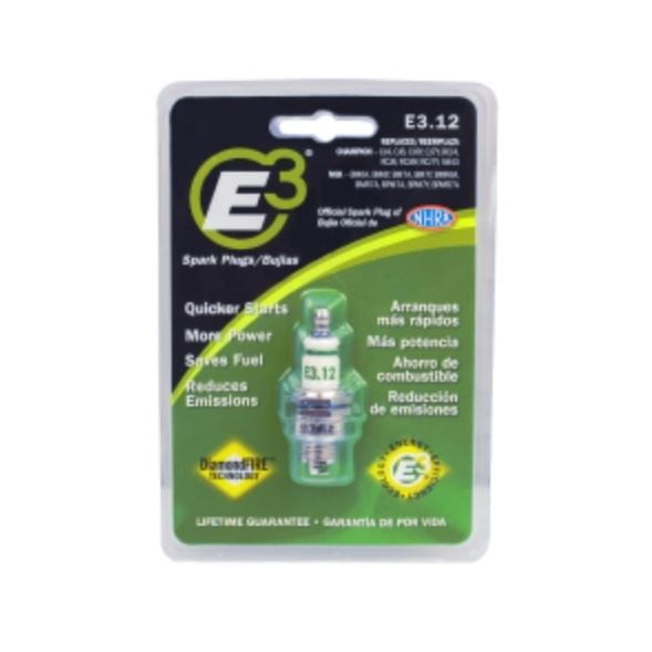 The advanced technology of an E3 spark plug allows the flame front to grow unimpeded to create a more complete burn increasing power and reducing the amount of fuel used. E3’s advanced spark technology produces cleaner combustion. E3 is used in multiple small engine applications especially in lawn and garden. The ground electrode is designed with E3’s patented Diamond FIRE technology, which is proven to improve power, increase fuel efficiency and dramatically lower hydrocarbon emissions in long-term use. A premium spark plug with a 100,000 mile warranty. To make certain E3.12 is correct for your machine, please reference your owner’s manual.E3.12 spark plug was designed for 2-cycle small engines