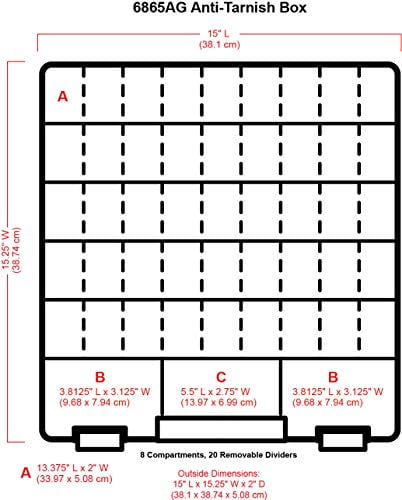 Features a secure latch, is acid-free and designed to easily stack and work together. Made with a special additive exclusive to ArtBin. The additive forms a protective layer around metal surfaces that prevents tarnishing for 5 years. Safely store and preserve non-ferrous metals. Translucent polypropylene, shatterproof boxes.FLAMBEAU-The answer for safely storing and preserving all of your sterling silver jewelry, beads and components A special additive, exclusive to ArtBin has been molded directly into the dividers The tarnish inhibiting additive in the dividers forms a protective layer around silver surfaces that prevents tarnishing for five years Includes 8 compartments with 21 grey removable dividers 5 compartments measure 2×135×15 inches, 2 compartments measure 35x4x15 inches, , 1 campartment (divider storage compartment) measures 35×55×15 inches Over all dimensions: 1525x14x2 inches