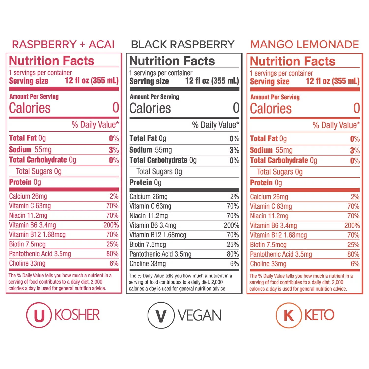 - Flavors: Raspberry + Acai, Mango Lemonade, Black Raspberry