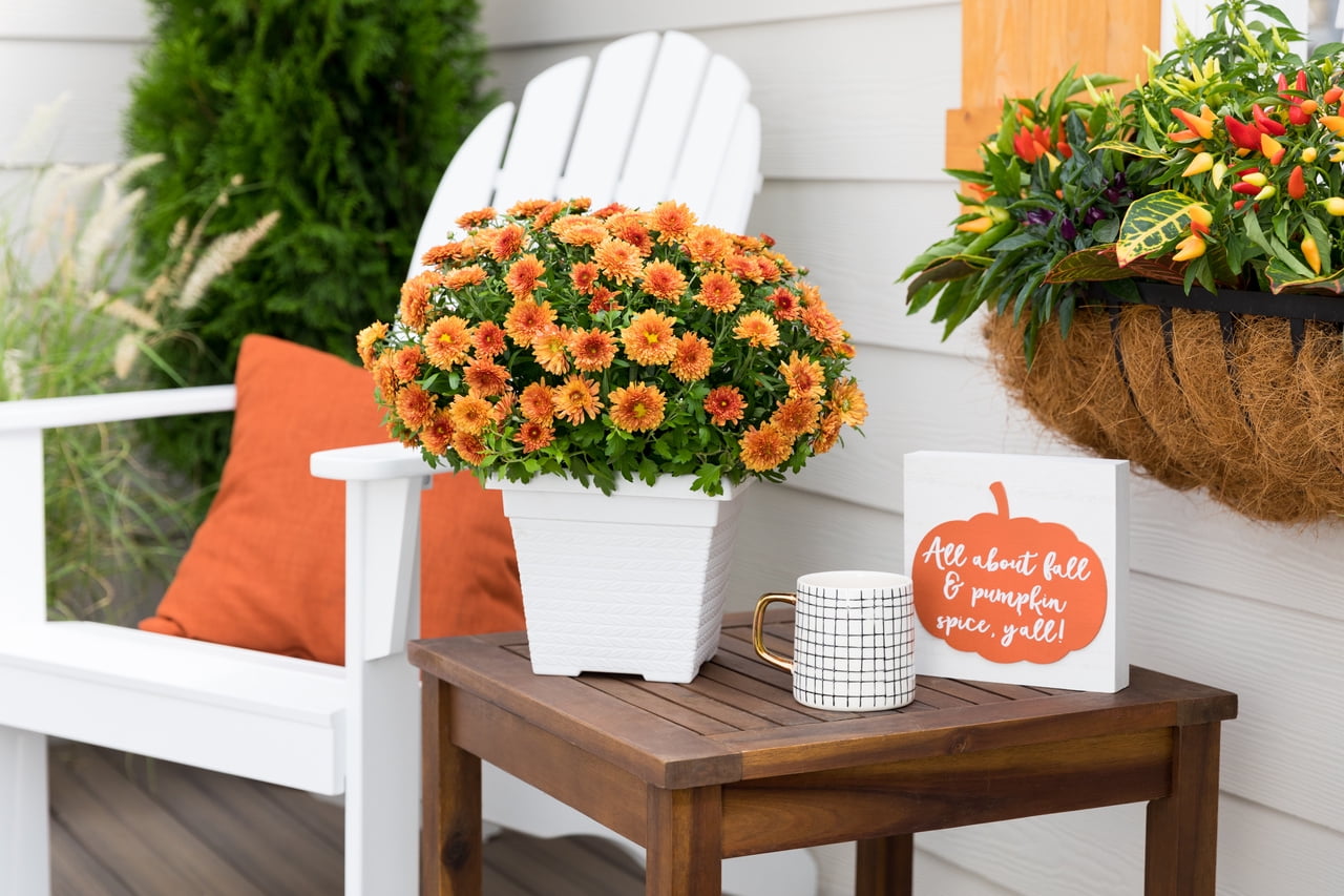Decorate your outdoor spaces with fall color, this season, using garden mums! Better Homes & Garden’s beautiful orange mum has a pumpkin spice fragrance and comes in a decorative planter bringing the sights and smells of fall to your porches and patios. Simply place this planter in sunny, outdoor spaces or mix and match it with your existing fall containers to create a unique container-scape! This fall bloomer will arrive to you with minimal open flowers. We ship them this way to ensure they arrive safe and healthy, but more importantly so you can enjoy their beautiful flowers longer. Remove them from the box and water garden mums if the soil feels dry. For healthy live plants, water until established. Once established, water every other day until soil is moist. Make sure to check daily during hot, dry weather. Feed garden mums once a month and remove old flowers to promote new blooms. Coordinates with Better Homes & Gardens candle collection, Pumpkin & Chai scent.