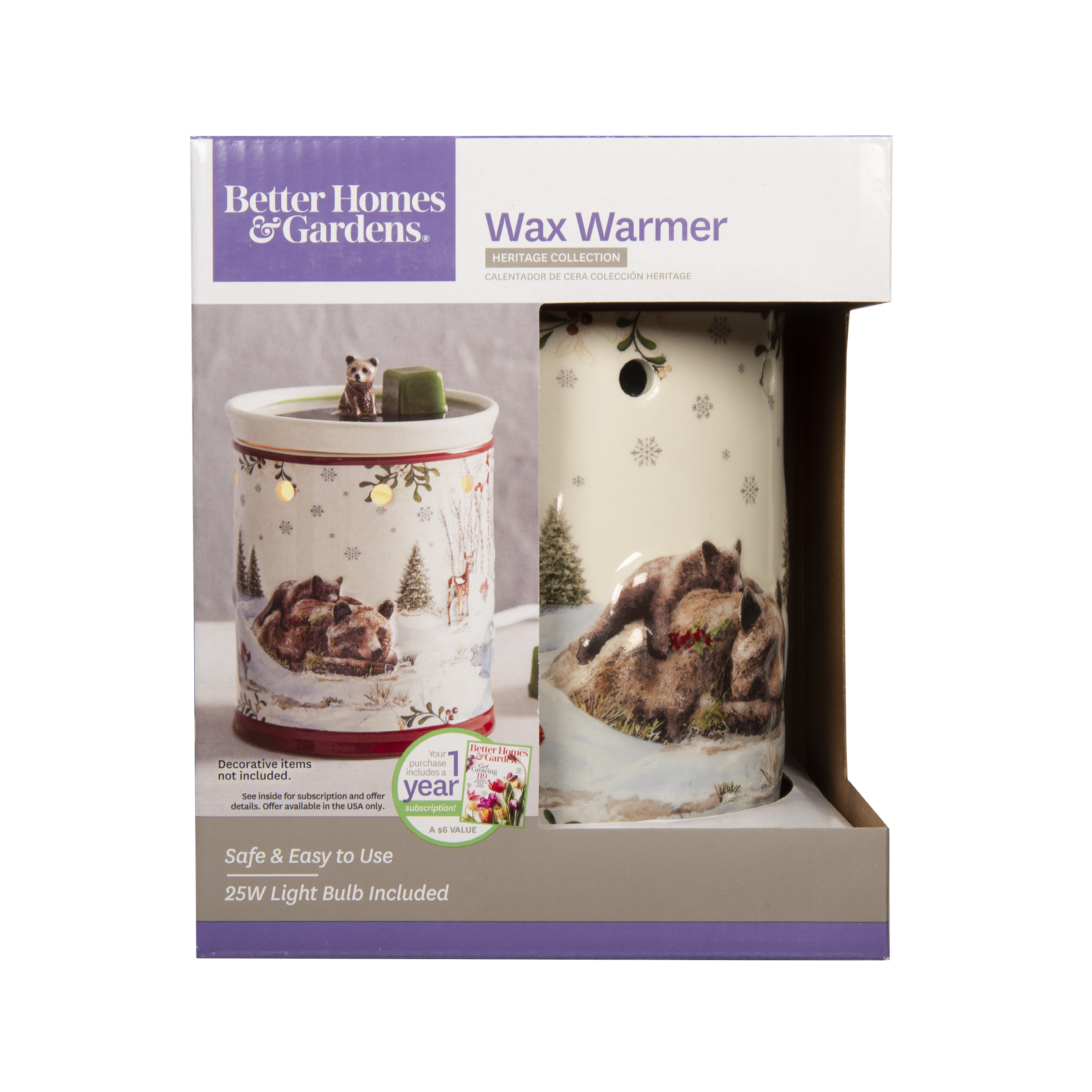 The Better Homes & Gardens Heritage Collection Full Size Wax Warmer continues this year with a new and beautiful scene. The ceramic base features an iconic scene of a mama and baby bear relaxing in the snow covered woods with a little fawn staring off to the side. The warmer is topped with another baby bear on the wax tray. Don’t miss this limited edition Heritage Collection wax warmer. It gently melts scented wax, releasing aromatic scents that fill an entire room with inviting warmth. It produces a soft glow when plugged in. The 25W light provides a soft, decorative atmosphere and melts your choice of fragrance wax cubes. The fragrance wax warmer is the perfect option for a safe heat source to melt your choice of fragrance wax melts with no soot or residue. This Better Homes & Gardens Wax Warmer is perfect for adding the right amount of ambience and fragrance to your space.