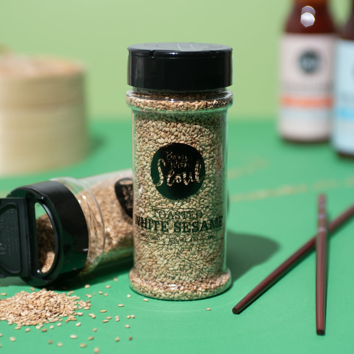 BORN WITH SEOUL TOASTED WHITE SESAME SEEDS 4.25 ounce ready to serve bottle. For an infusion of subtle smokiness and crunch, Born With Seoul Toasted White Sesame seeds turns a pretty good into a pretty great. Comes in a jar with an easy to use shaker style top.