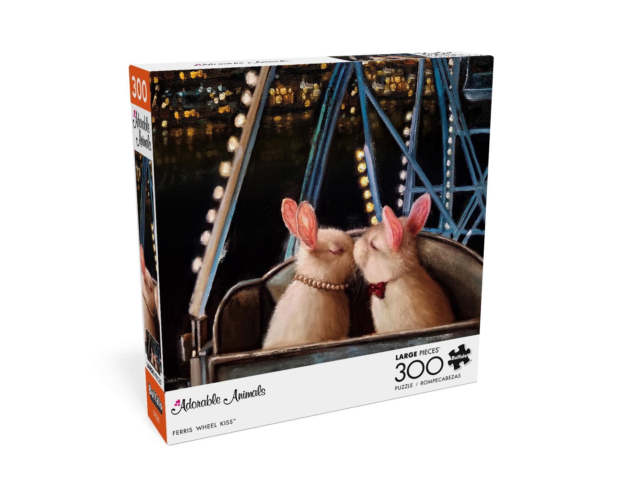 Enjoy piecing together this puzzle from the Adorable Animals Collection titled Ferris Wheel Kiss. Two adorable bunnies enjoy a Ferris Wheel kiss on their date at the carnival. How cute. The pieces of this puzzle are 67% larger than traditional puzzle pieces, which makes them easier to see and hold for a pleasant puzzle experience. Every Buffalo Games jigsaw puzzle is manufactured from recycled puzzle board. A precision cutting technique guarantees that every piece will fit soundly with the company’s signature Perfect Snap™.