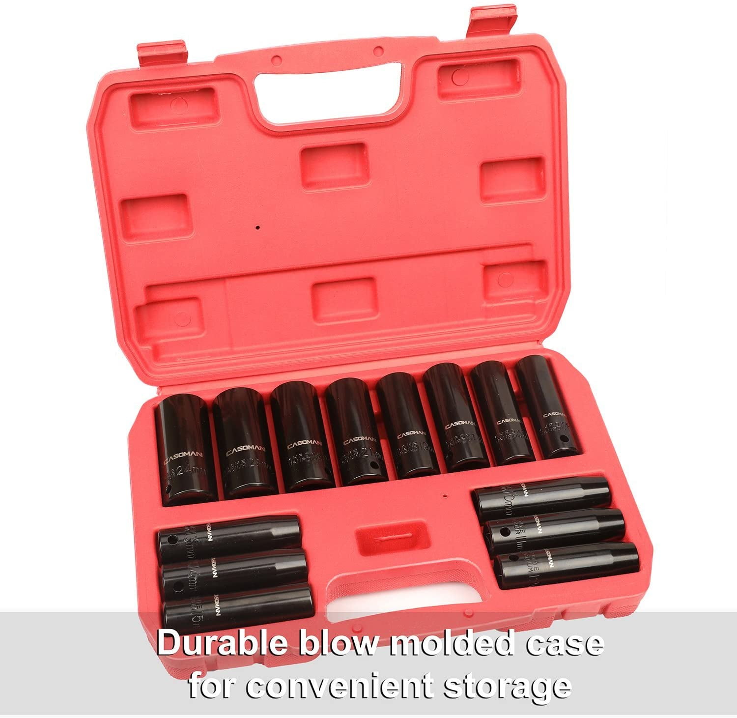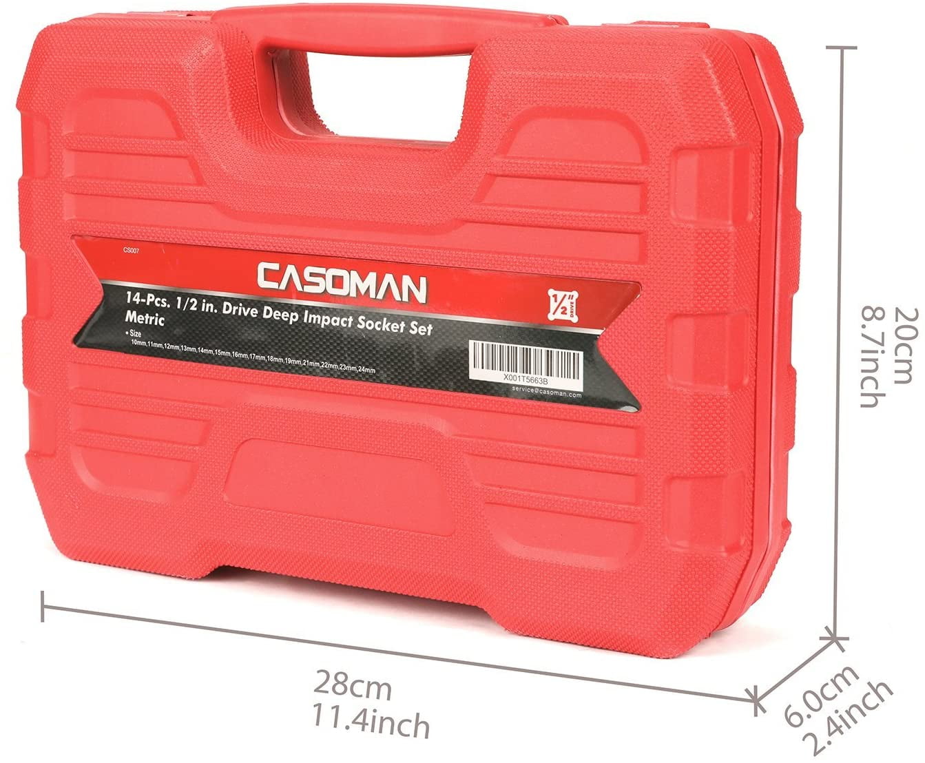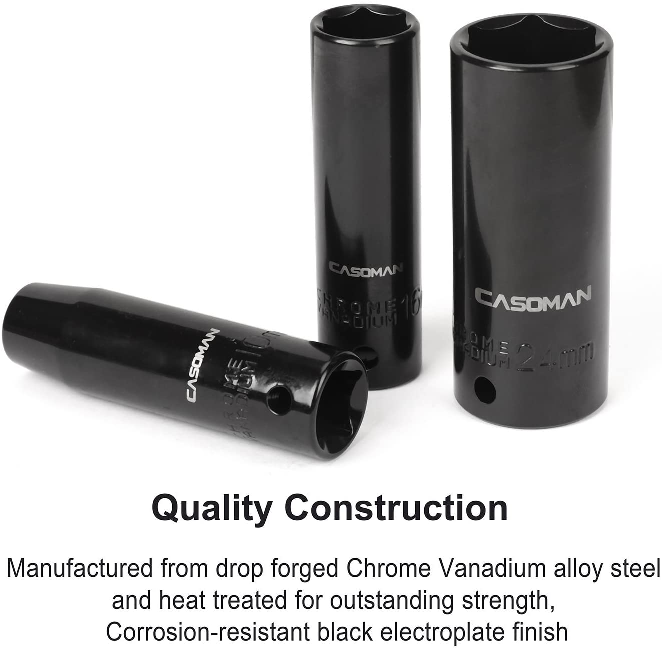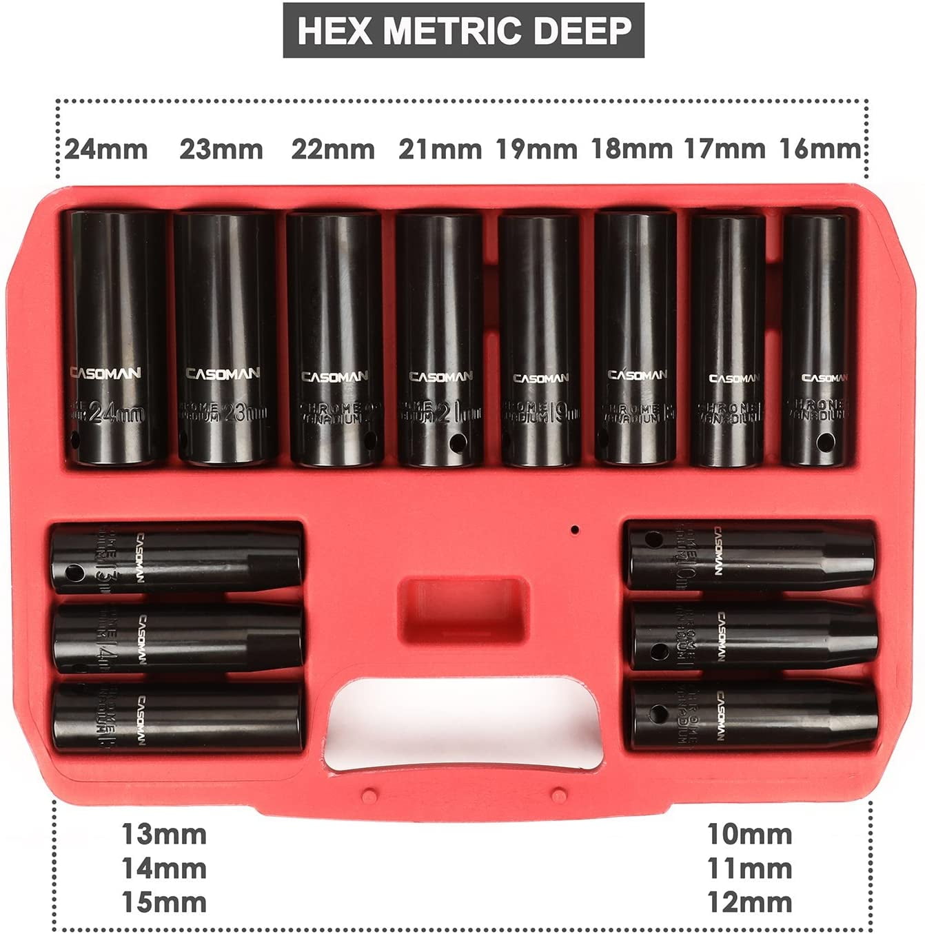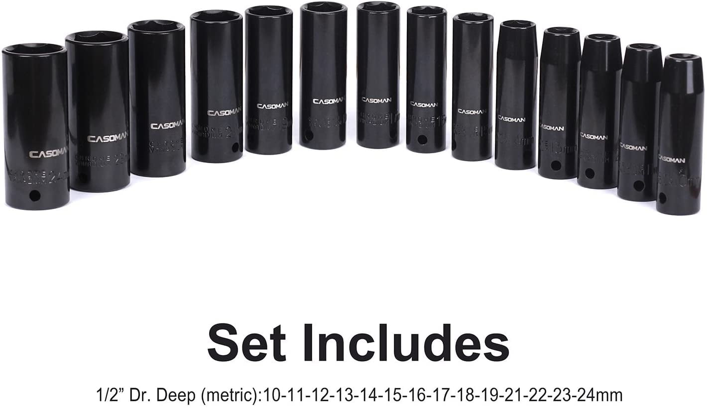 The CASOMAN 1/2-inch Drive Deep Impact Socket Set, Metric, Cr-V, 6-Point, 10mm-24mm, 14-Sockets Set. Made from high-strength chrome vanadium steel, corrosion-resistant black electroplate finish, resulting in a longer useable life. Our impact sockets meet or exceed ANSI performance standards.