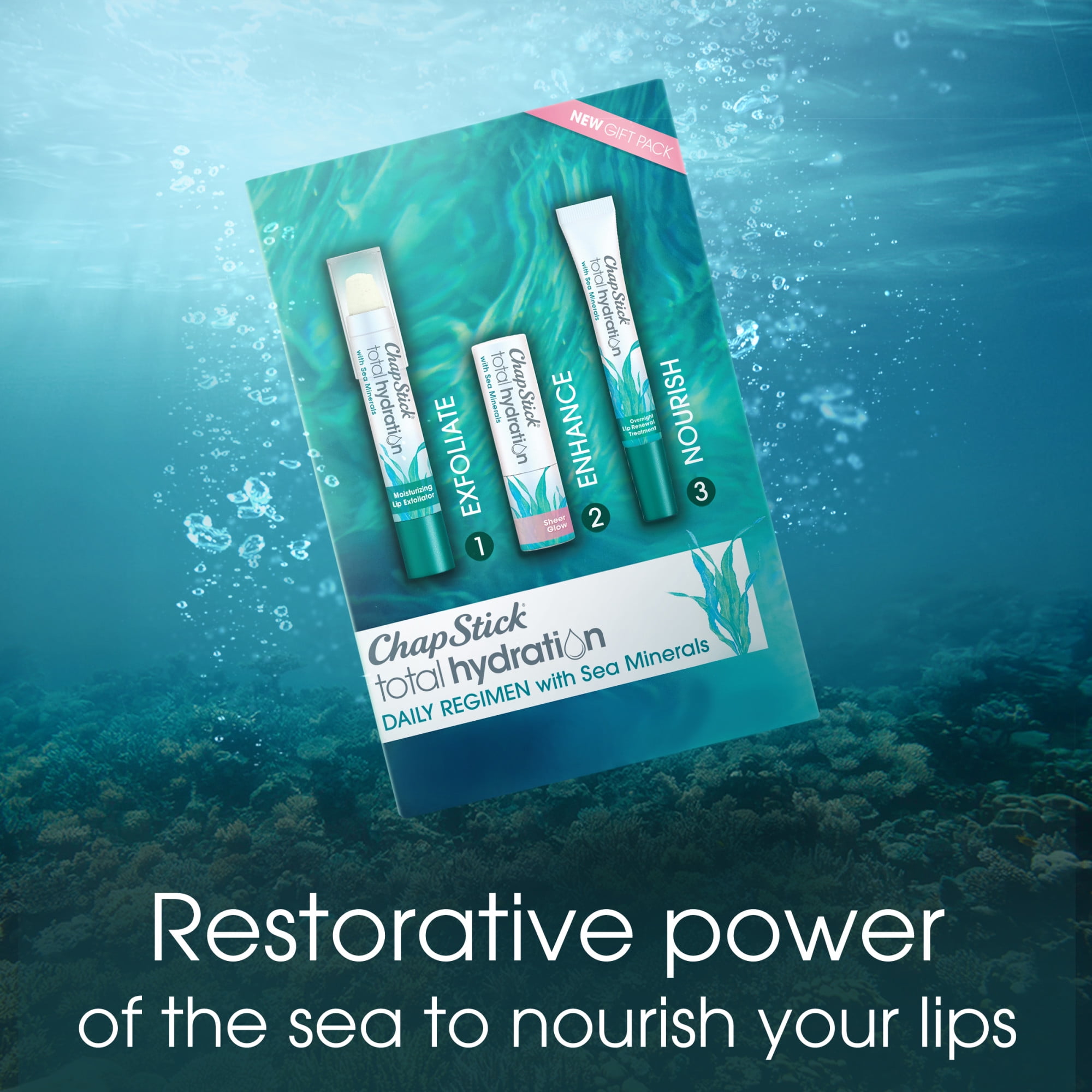 - One gift pack of three tubes of ChapStick Total Hydration Sea Minerals Moisturizing Lip Exfoliator, Overnight Lip Moisturizer and Tinted Lip Balm