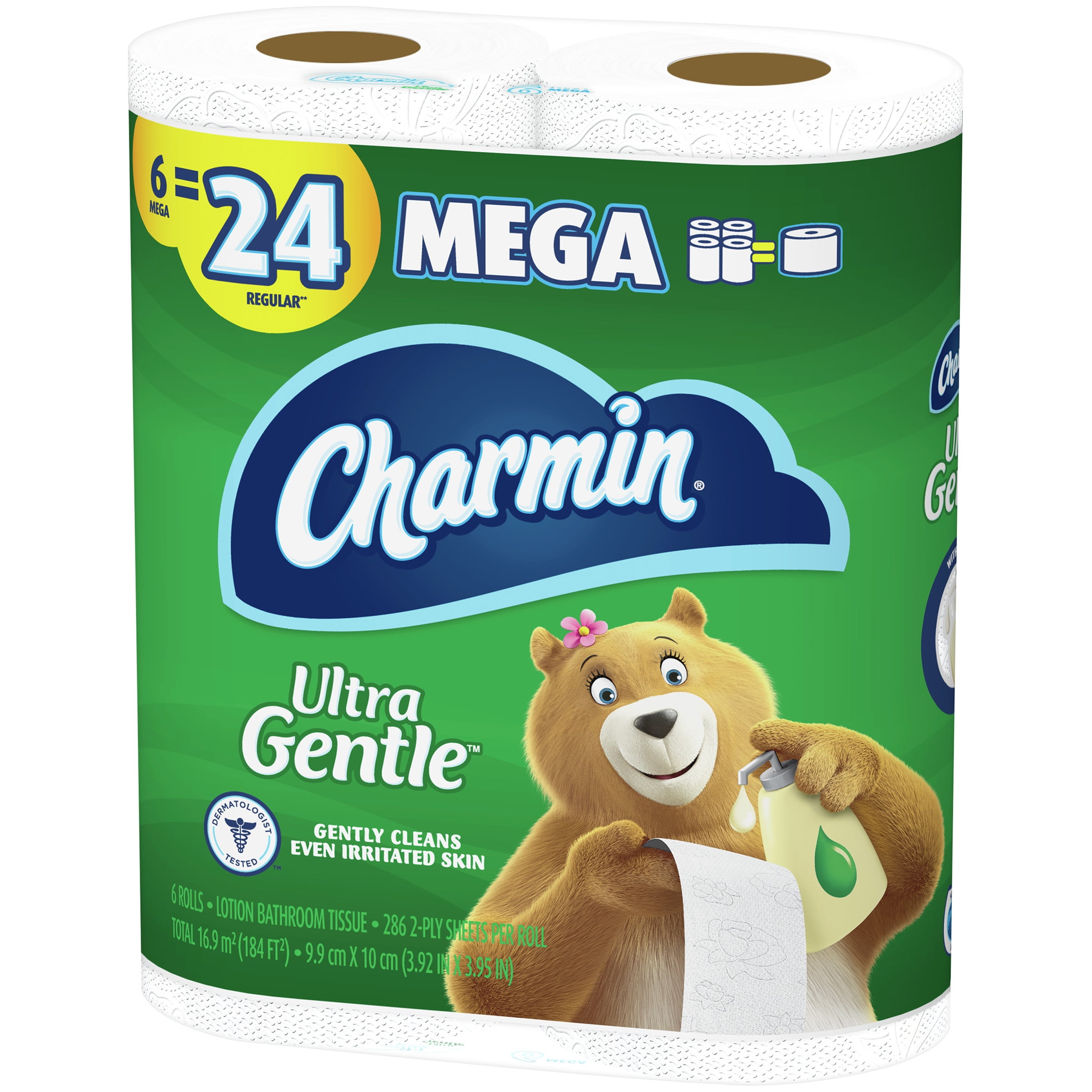 Unlike ordinary toilet paper that can irritate in use, Charmin Ultra Gentle is dermatologist-tested to gently clean even irritated skin. That’s because Charmin Ultra Gentle toilet paper has the Charmin softness you love with a touch of soothing lotion. When you buy Charmin Ultra Gentle Mega Roll toilet paper, you get a big, long-lasting roll because one Charmin Mega Roll equals 4 Regular Rolls. We all go to the bathroom, those who go with Charmin Ultra Gentle toilet paper really Enjoy the Go. (Based on number of sheets in Charmin Regular Roll bath tissue)