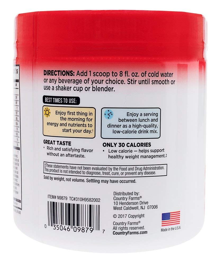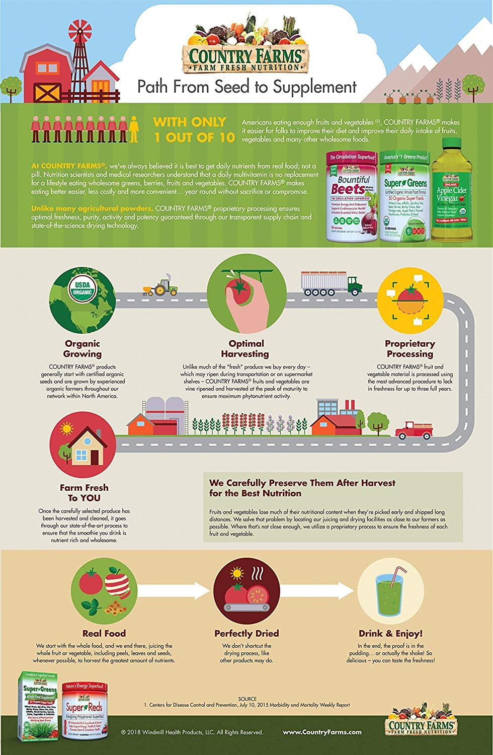 - STRAIGHT FROM THE GARDEN – Don’t skimp on your fruits and veggies consumption! Just one serving of Country Farms Super Reds provides 48 of the most desirable superfoods and berries to help supplement your diet, promote immunity and keep you healthy.