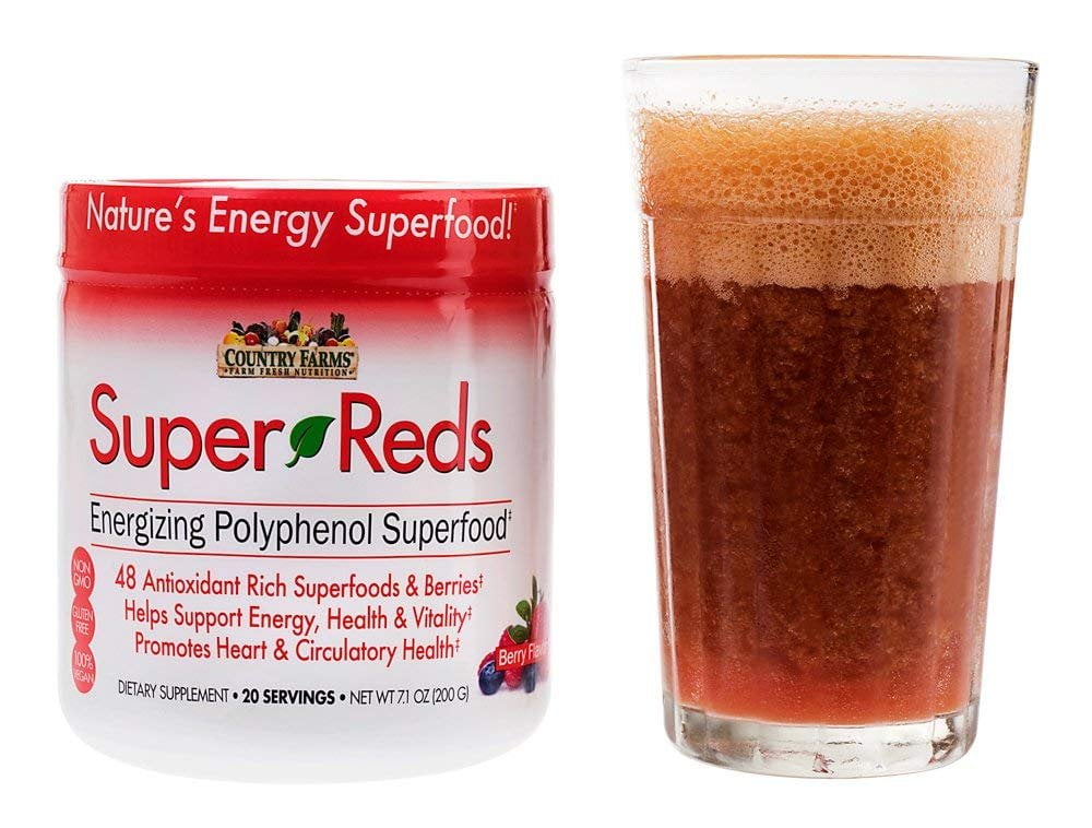 - PACKED WITH POTENT ANTIOXIDANTS – Because it is packed with 48 antioxidant-rich superfoods and berries Country Farms Super Reds contains powerful polyphenols and other potent antioxidants. These compounds help naturalize harmful free radicals and promote heart, circulatory, and brain health.