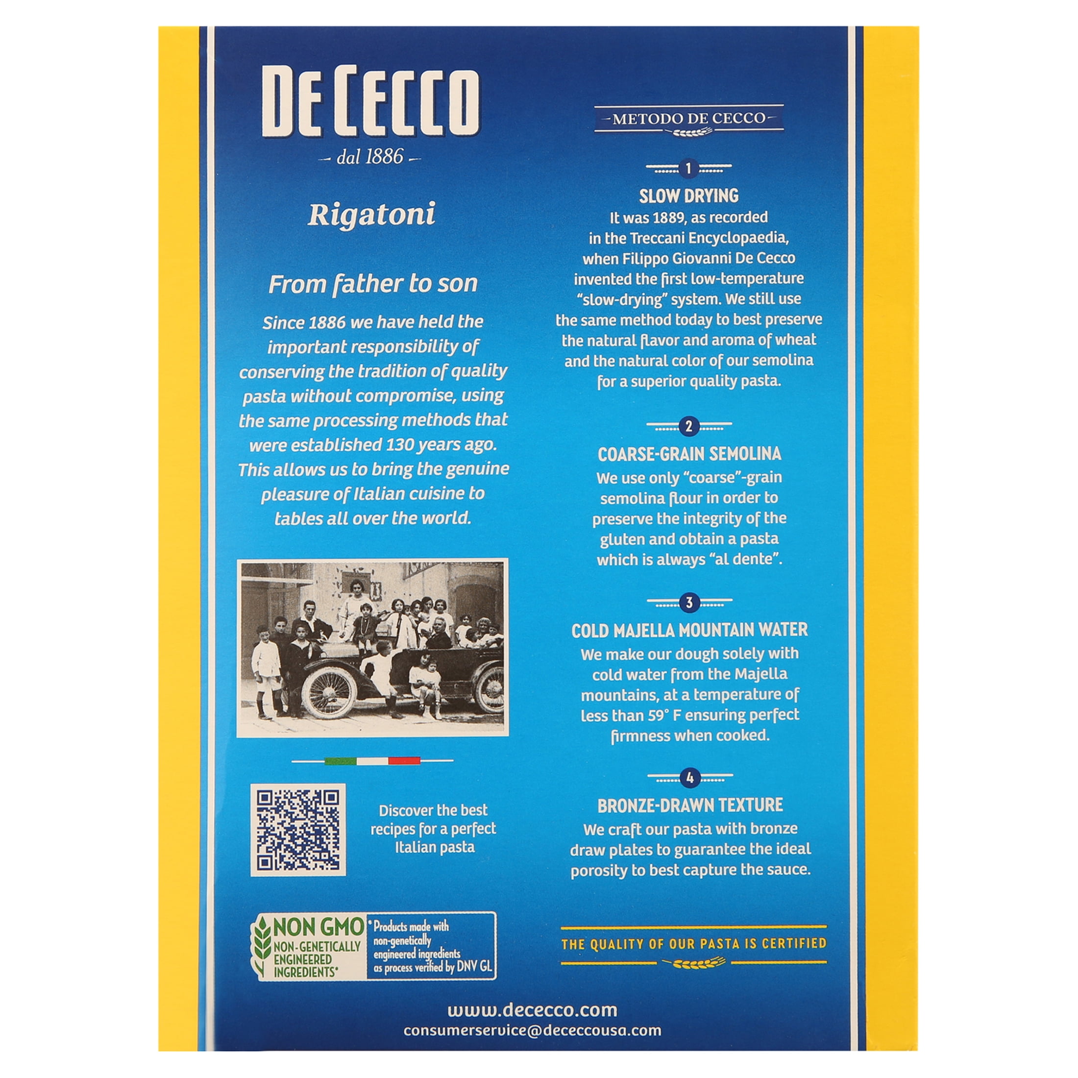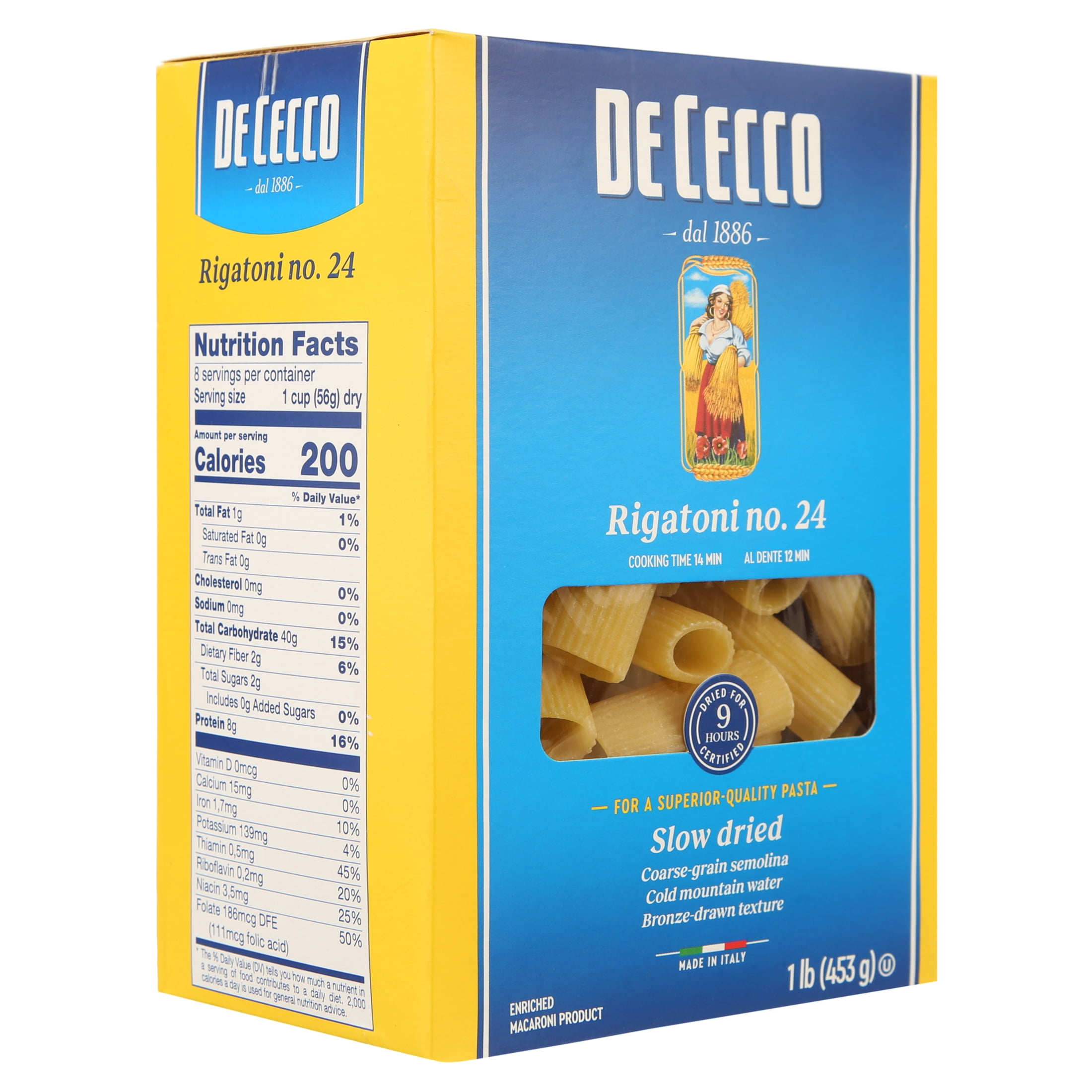 100% Durum Wheat Coarse Semolina Pasta, knead with pure spring water, shaped through Bronze Dies, Slowly Dried at Low Temperature to Preserve Nutritional Properties. Kosher product ï¼Slowly Dried at Low Temperature to Preserve Nutritional Properties ï¼Only Pure Cool Spring Water ï¼Shaped through Bronze Dies ï¼Slowly Dried at Low Temperature to Preserve Nutritional PropertiesRIGATONI 12X1 LB