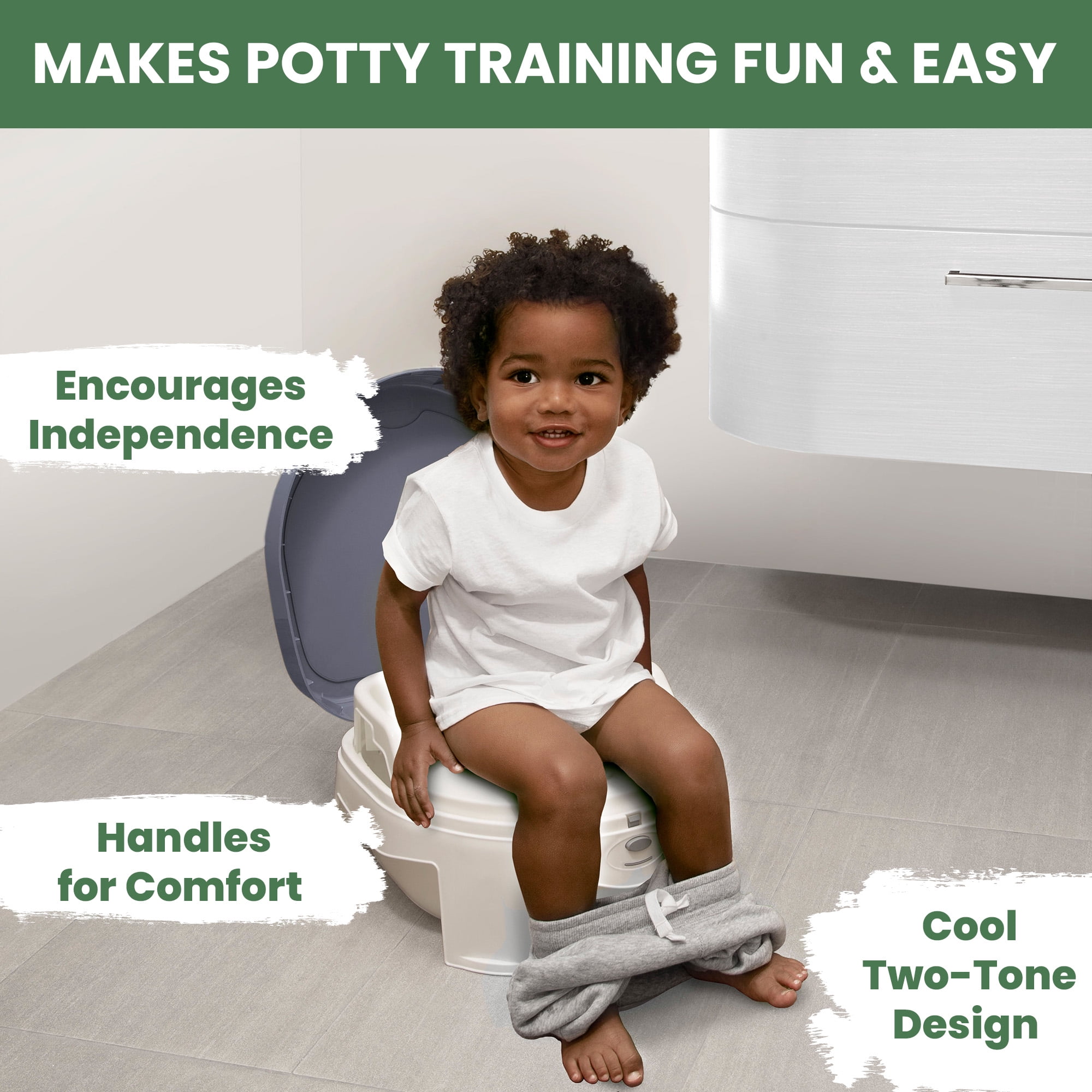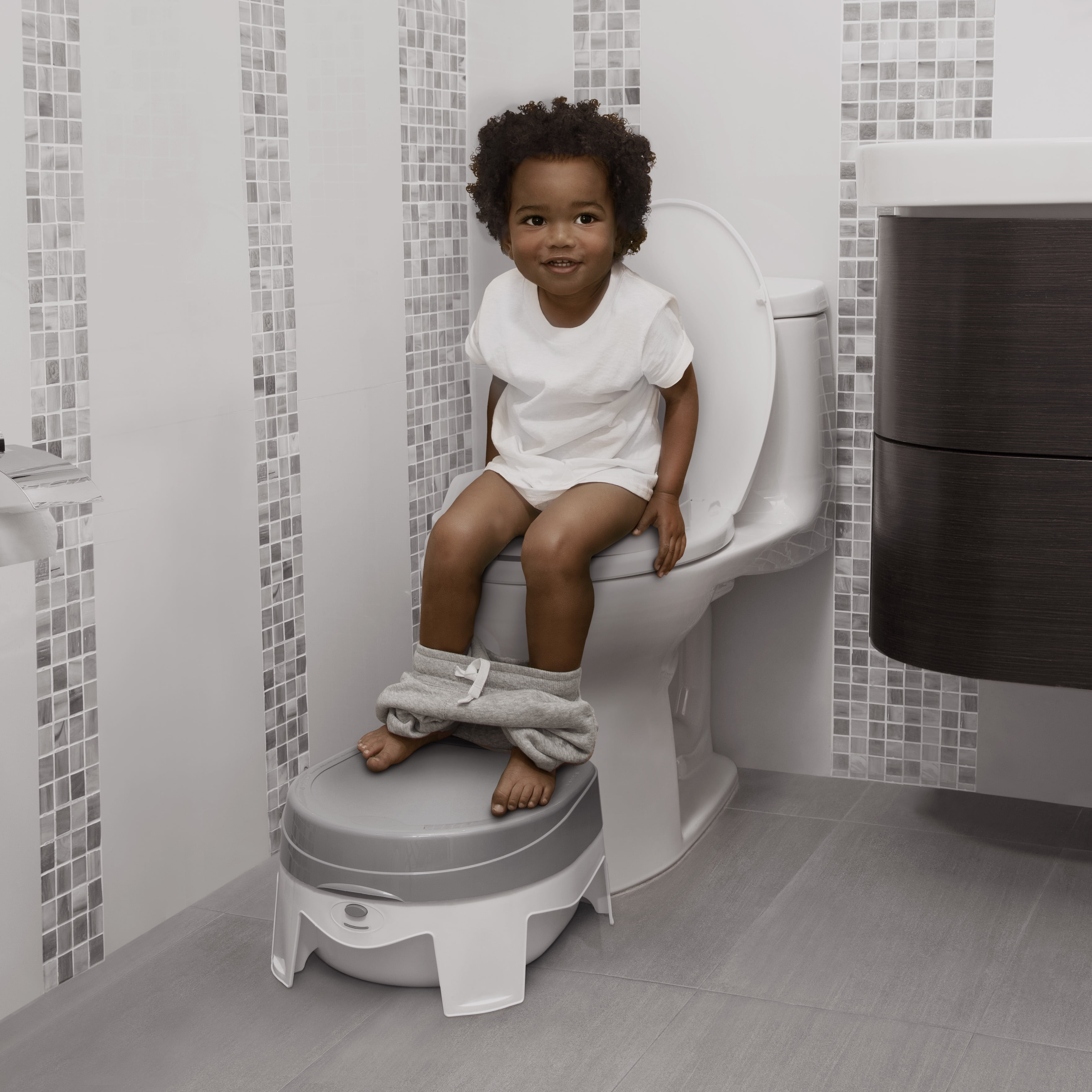 - 3-IN-1 POTTY: This versatile potty seat converts to a toilet seat for adult-size toilets and step stool for use at the sink and toilet when your child is ready, Seat adjusts and locks into place to provide secure fit on round or elongated toilets