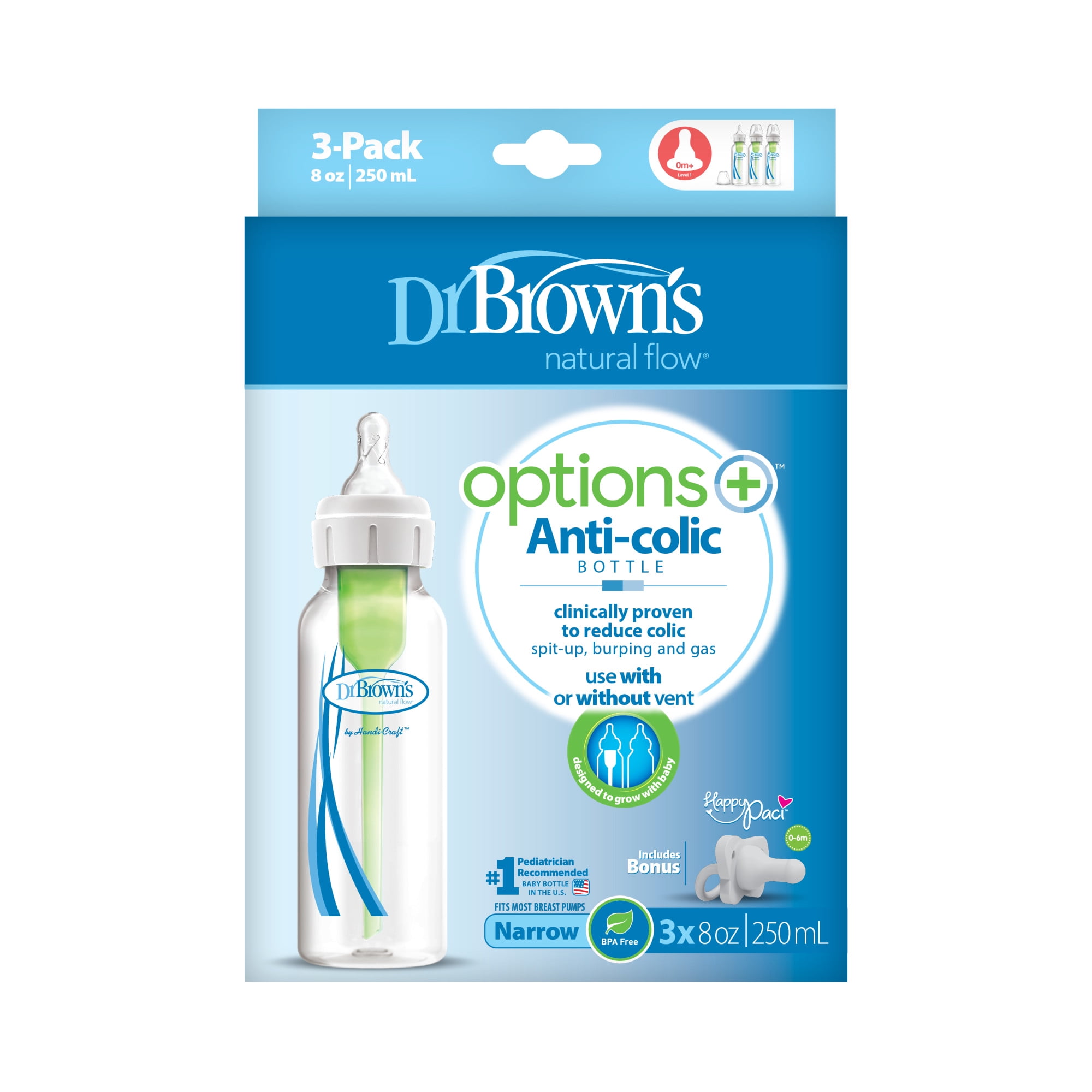 Your options have never been better with Dr. Brown’s Natural Flow® Options+™ Narrow Baby Bottle. From nipple to base, the Options+™ Bottle makes for a comfortable feeding experience for baby. Each nipple is specially engineered to offer the same consistent, natural flow, so you and baby know what to expect. The soft silicone nipple helps baby naturally latch while the anti-colic vent system lets baby feed without fuss. Together, they offer a reliable and trusted bottle feeding experience that makes Dr. Brown’s the #1 pediatrician recommended bottle in the U.S. Plus, the anti-colic internal vent system is clinically proven to reduce colic, decreases spit-up, burping, and gas, better preserves nutrients in breast milk and formula, aids in digestion for a good night’s sleep, and offers a flow rate that supports breastfeeding. Options+™ Narrow fits most breast pumps. Dishwasher (top rack) and sterilizer safe. BPA free. 0m+.